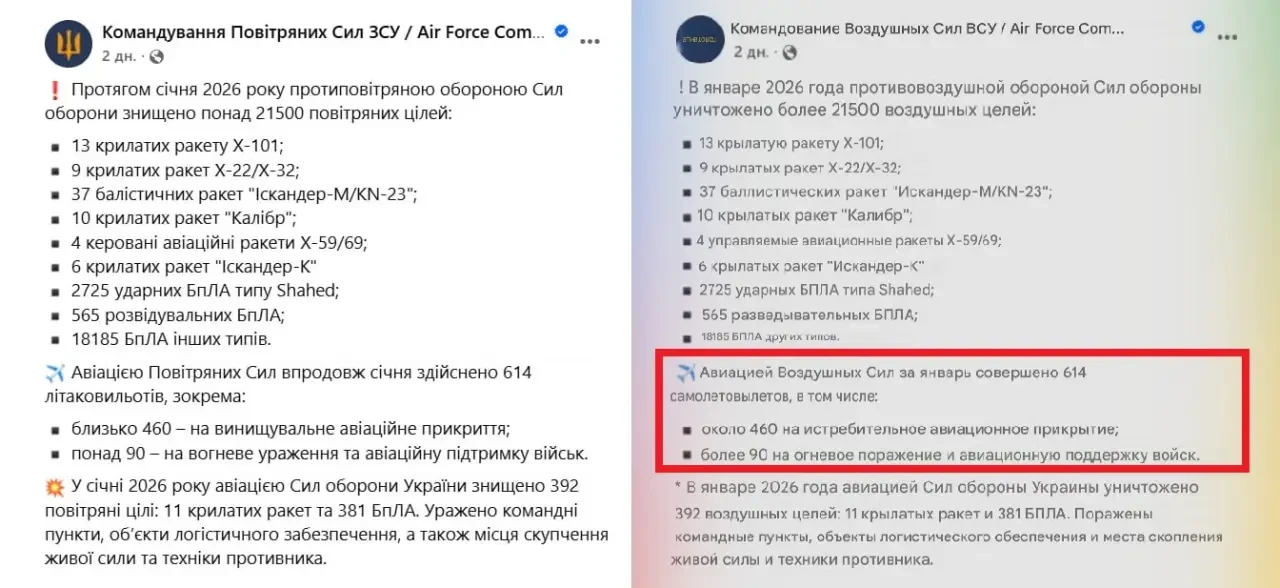 Данные о статистике боевых вылетов самолётов украинских ВВС в январе 2026 года, взятые с ресурсов противника