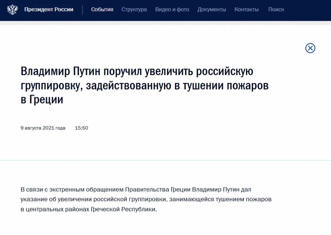 9 августа 2021 года. Сайт Кремля сообщает о том, что президент поручил увеличить численный состав российской группировки для тушения пожаров в Греции.
