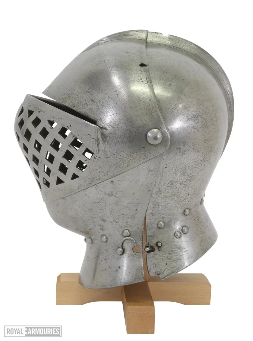 Шлем-бацинет. Хорошо видны довольно большие отверстия, дававшие участнику турнира и хороший обзор, и… воздух для дыхания. Ведь рыцари в металлических доспехах из-за того, что железо доспехов являлось отличным теплоизолятором, сильно перегревались. Поэтому было очень важно охлаждать хотя бы лицо и голову