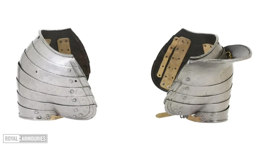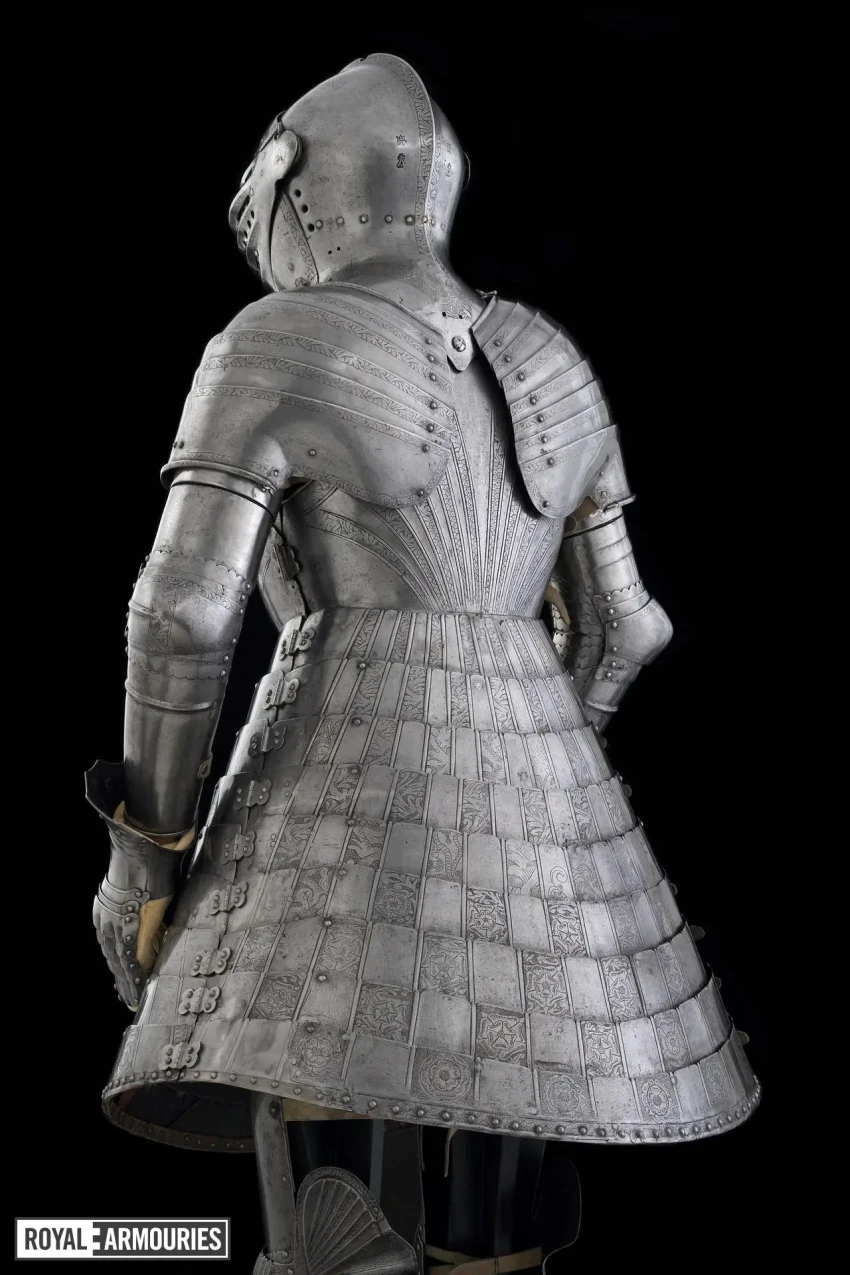 Наплечники из перекрывающих друг друга пластин стали отличительной особенностью мастерской в Гринвиче. Левый (если смотреть спереди) наплечник состоял из восьми полос, а вот правый почему-то из семи. Юбка состоит из девяти полос, как спереди, так и сзади. Петли на ней находятся слева, пряжки ремней справа. Латы для ног могли быть изготовлены в Италии или во Фландрии. Их попросту взяли от какого-то старого доспеха.