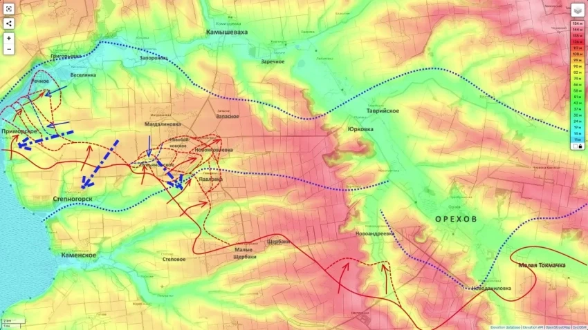 Потеряв главную линию обороны и допустив выход ВС РФ через Степногорск на север (вектор Приморское - Новояковлевка - Павловка), ВСУ оказались перед фактом: русские войска прорываются к Камышевахе и переправам через реку Конка.
