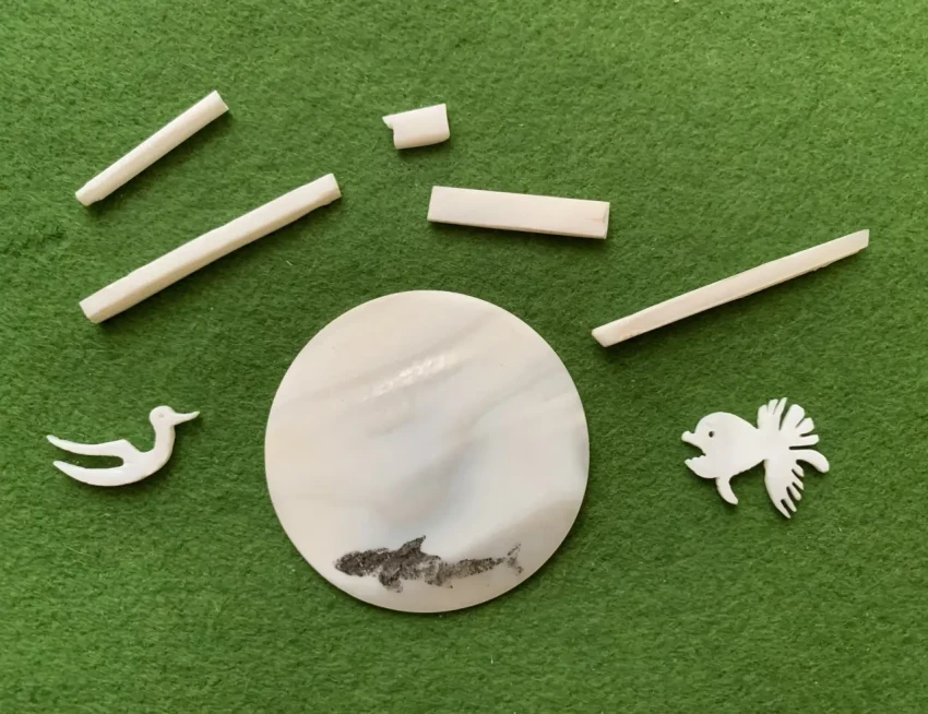 На фотографии диск из перламутра с напечатанным по трафарету изображением акулы, перламутровые пластинки и фигурки чайки и перистой рыбы, выточенные при помощи микродрели