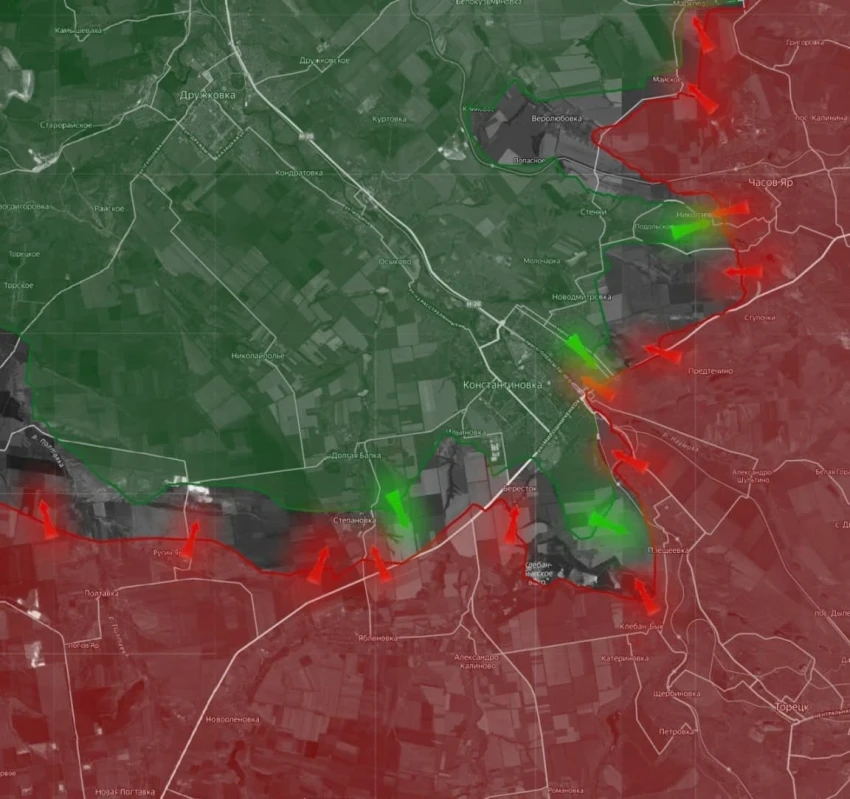 Бои за Константиновку становятся все более ожесточенными. По данным источника «Рядовой на передовой», ВС РФ ведут постоянные атаки в жилых районах на юге и юго-западе Константиновки. Российские войска развивают контроль на железнодорожную станцию, через которую проникают к металлургическому комбинату и к базе «Втормет».