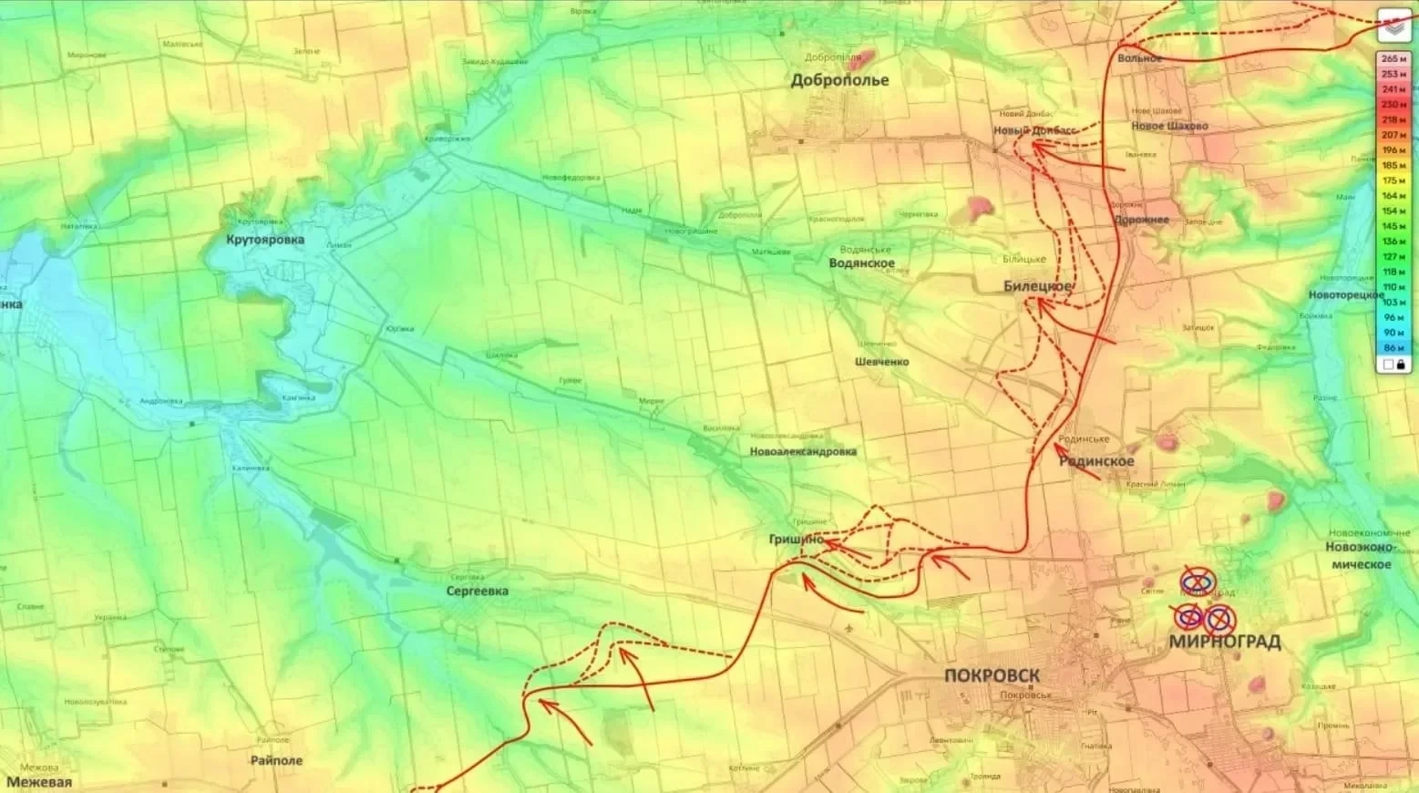 Продвижение также отмечается в направлении Рубцов и Коровьего Яра. Эти действия могут быть связаны с попыткой выйти к реке Оскол - важному природному рубежу, который играет роль в организации обороны и снабжения.