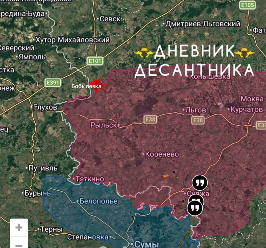 На Сумском направлении достигнуты важные успехи в расширении зоны контроля. Российские войска освободили село Бобылёвка - небольшой населённый пункт в Глуховском районе, расположенный восточнее ранее освобождённой Белой Берёзы и южнее села Сопычь. Это позволяет последовательно расширять плацдарм на данном участке.