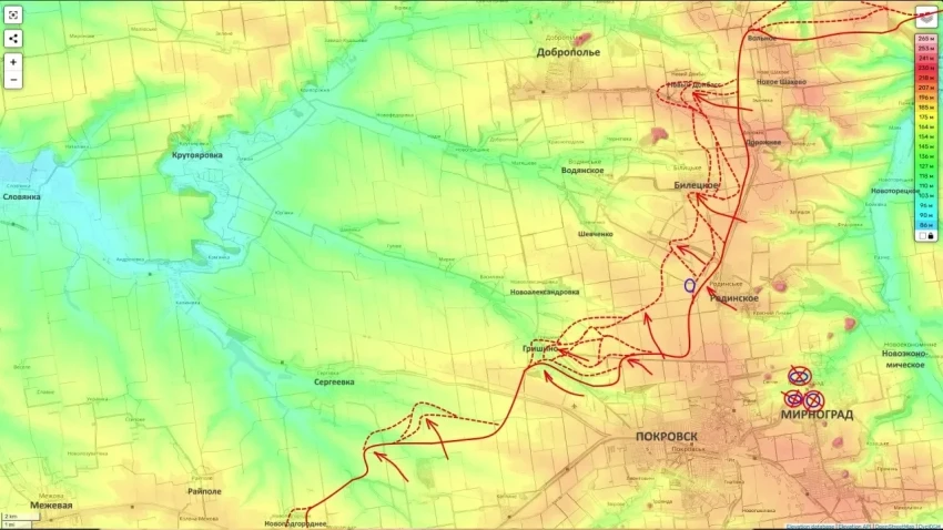 В районе Покровска и Мирнограда, по данным Юрия Подоляки, развернулось одно из наиболее тяжёлых встречных сражений последних дней. Он описывает бои в полосе от Гришино до Нового Донбасса как чрезвычайно напряжённые, с постоянными атаками и контратаками обеих сторон.