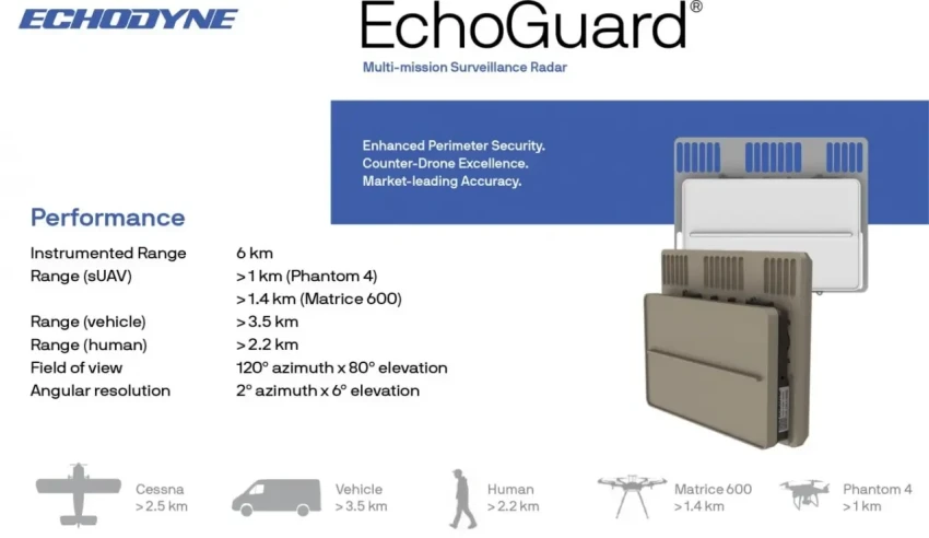 Для слежения за воздушной обстановкой, поиска целей и предварительного наведения вооружения используется компактный радиолокатор Echodyne EchoGuard американского производства. Крупные воздушные цели он засекает на расстоянии не менее 5-6 км. Для малых БПЛА дальность обнаружения и сопровождения сокращается до 1-1,5 км. На одной мачте с антенной РЛС смонтирована ОЭС с дневным и ночным каналом, а также лазерным дальномером.