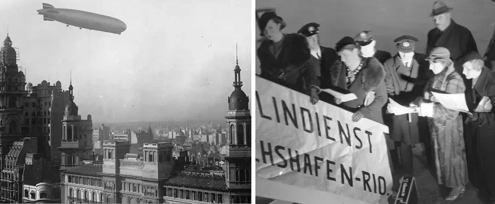 «Граф Цеппелин» стал первым дирижаблем, совершившим кругосветное путешествие, причем значительная часть пути проходила через Аргентину. После этого, компания Luftschiffbau Zeppelin GmbH начала организовывать регулярные маршруты дирижабля включали рейсы в Южную Америку с посадками в Бразилии и Аргентине, что способствовало ранним трансатлантическим авиаперелетам и развитии воздушного сообщения между Европой и Южной Америкой. В то время, даже быстрые самолеты еще не обладали достаточной дальностью полета для дальних пассажирских и грузовых перелетов, а океанские суда, ранее монополизировавшие океанские просторы, были значительно медленнее дирижаблей... На фото слева: дирижабль «Граф Цеппелин» в небе Буэнос-Айреса. На фото слева: посадка в Гамбурге на трансатлантический рейс «Графа Цеппелина»