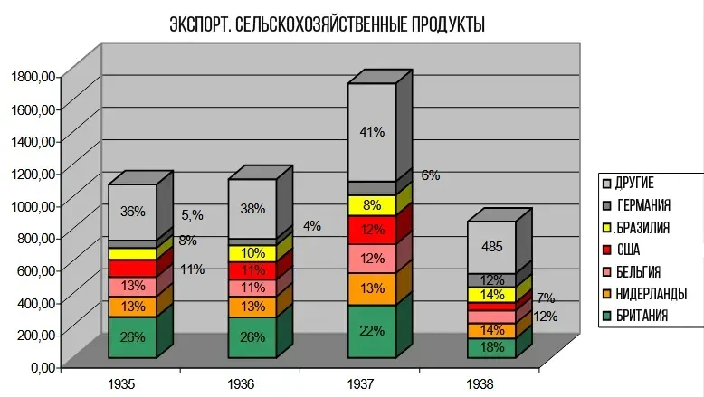 Довоенный экспорт аргентинской сельскохозяйственной продукции по странам. Начиная с XX века традиционные продукты крупного рогатого скота, такие как шерсть, шкуры и жир, доминировали в аргентинском экспорте, где плодородный регион Пампас, на юго-востоке страны, обеспечивал земельную базу, сделав Аргентину крупным игроком на мировом рынке сельскохозяйственной продукции. Успехи Аргентины в сельском хозяйстве в этот период значительно укрепили экономику страны и позволили ей превзойти других экспортеров сельскохозяйственной продукции, таких как Австралия, США, Канада и Бразилия...