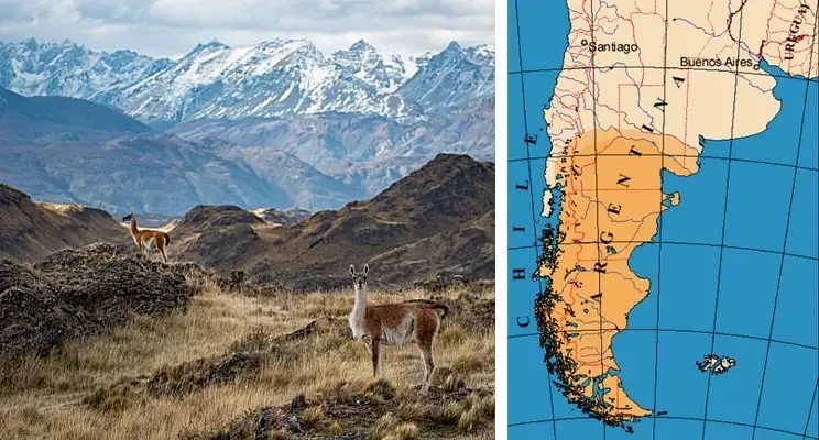 Патагония в 1930-х и 1940-х годах переживала период значительных перемен и развития, особенно в экономике и инфраструктуре, на которые влияли как национальные, так и международные события. Хотя регион сохранял свой суровый, малонаселенный характер, здесь развивалось скотоводство, развивался туризм, и началась его интеграция в более широкую экономику Аргентины. Справа - Карта Патагонии (выделена оранжевым)