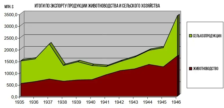 График аргентинского экспорта сельхозпродукции и продукции животноводства за период 1935-1946 годы. В период с 1935 по 1946 год экспорт сельскохозяйственной и животноводческой продукции Аргентины имел решающее значение для экономики страны, особенно во время и после Второй мировой войны. Аргентина была одним из крупнейших мировых экспортеров сельскохозяйственной продукции, такой как говядина, пшеница и шерсть, а Великобритания была основным рынком экспорта. В этот период наблюдалось значительное положительное сальдо торгового баланса, включая значительный профицит во время Второй мировой войны...