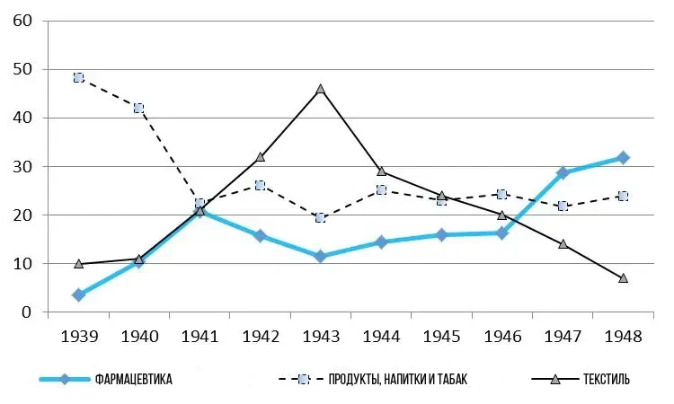Экспорт промышленной продукции Аргентины (в процентах от общего объема) в период Второй мировой войны. Аргентинская фармацевтическая промышленность в 30-40-х годах характеризовалась ростом числа отечественных научных лабораторий. В этот период некоторые компании сосредоточились на традиционном химическом производстве, а другие были заняты в биотехнологиях. Последовательный рост импорта оборудования из Европы и США способствовал повышению производительности практически во всех промышленных секторах Аргентины...