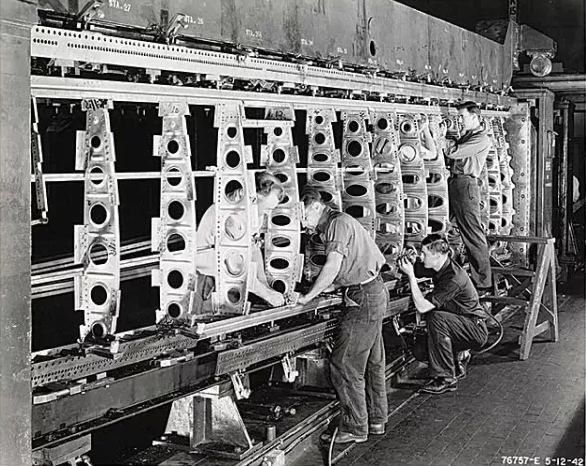 В анналах мировой индустриальной истории редко встречаются события, способные столь четко разделить технологическую эпоху на «до» и «после». До начала Второй мировой войны американская, да и мировая авиационная промышленность, по своей сути оставалась высокотехнологичным, но все же ремесленным производством. Самолеты не сходили с конвейеров нескончаемым потоком, как автомобили; они строились поштучно. Бригады высококвалифицированных рабочих и инженеров собирались вокруг неподвижного стапеля, на котором медленно, деталь за деталью, словно при постройке морского судна или возведении дома, вырастал фюзеляж. В то время для любой авиастроительной компании выпуск одного многомоторного самолета в день считался пределом производственных мечтаний и поводом для гордости.