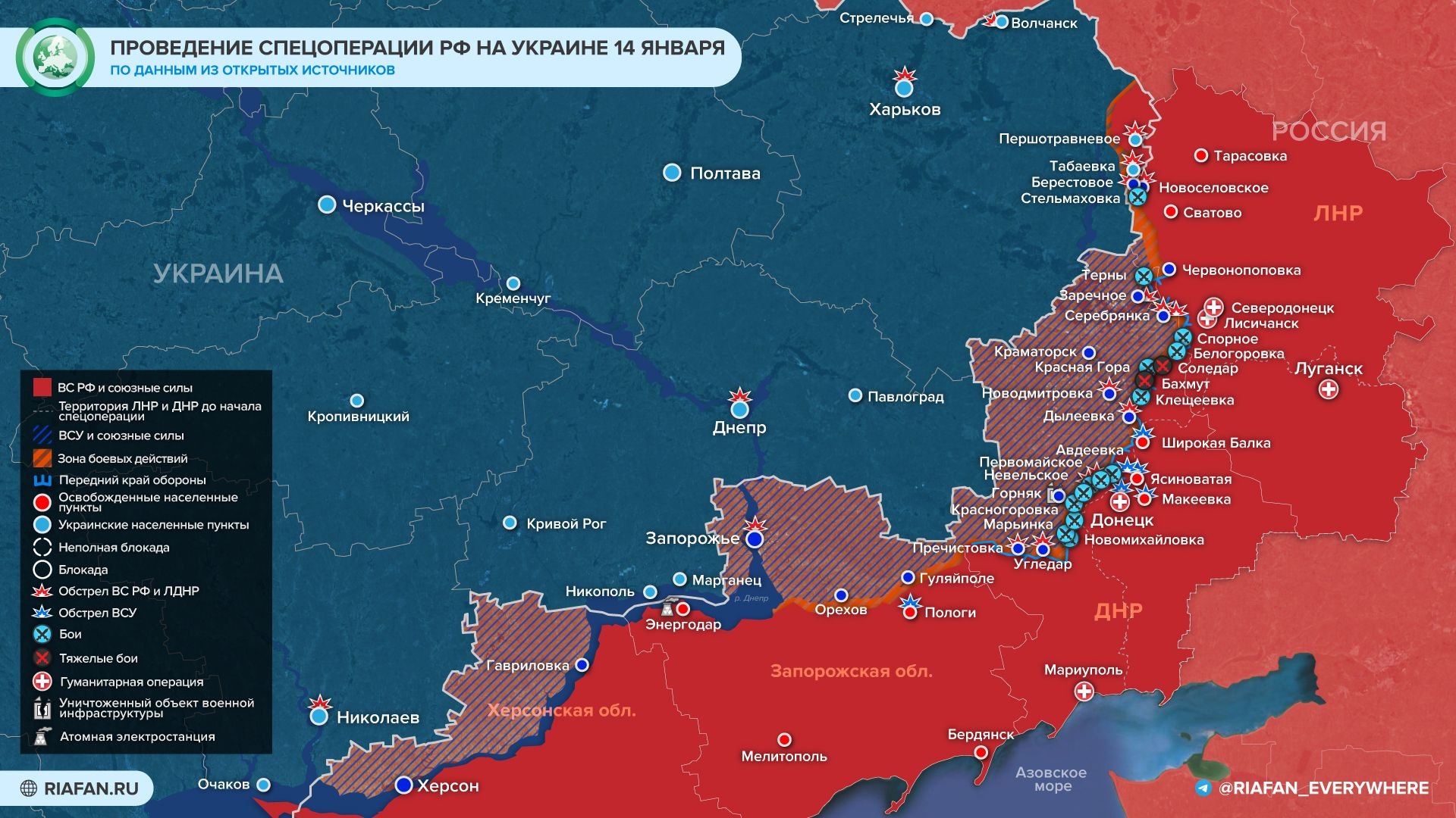 Обновленная новая карта боевых действий на Украине по данным на утро 15 января — Минобороны обновило новую карту боевых действий 15.01.2023