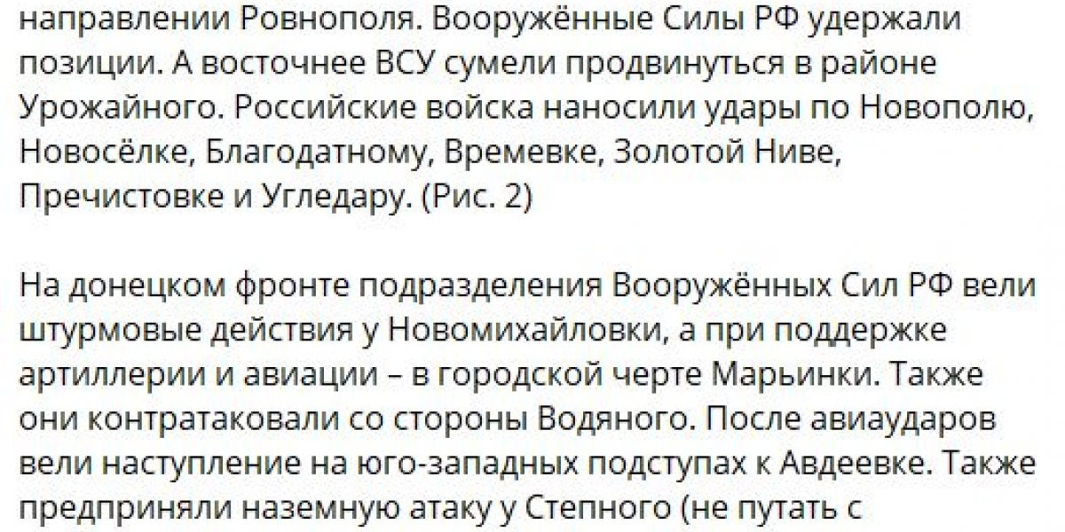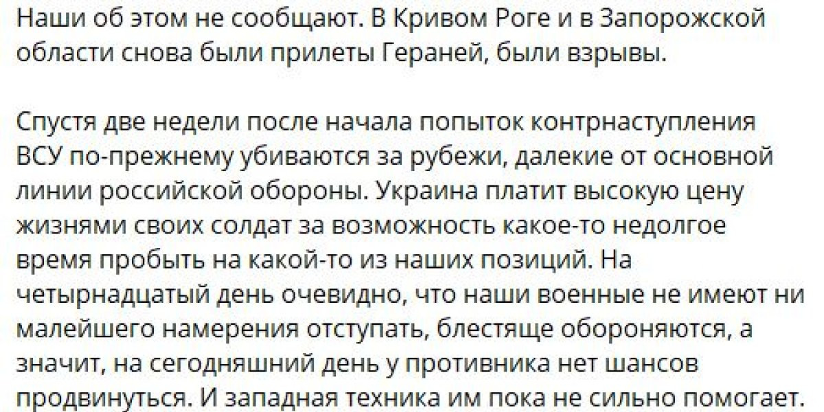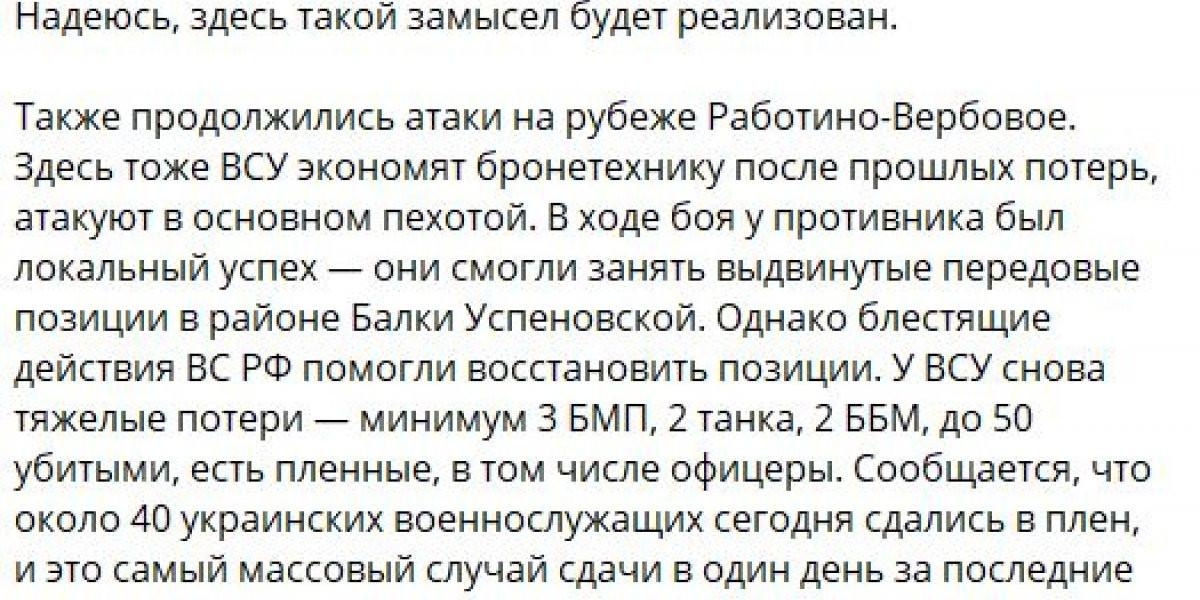 Также канал опубликовал информацию о вероятном восстановлении контроля над ранее оставленным селом Пятихатки. Днем 18 июня ряд источников сообщил, что под напором пехоты ВСУ российские войска отошли на второй рубеж обороны, после чего по украинским формированиям были нанесены массированные авиационные и артиллерийские удары.