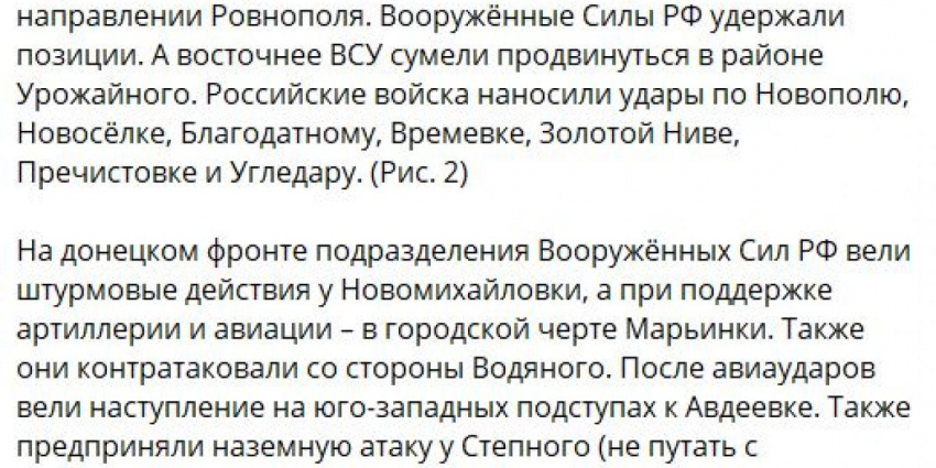 Отмечается также, что несмотря на натиск противника в этом района российские военные продолжают держать оборону.