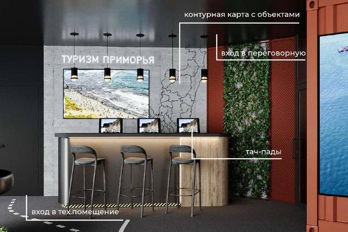 Зона “Туризм и культура” будет представлена интерактивным баром, на котором для посетителей будут установлены планшеты с приложениями дополненной реальности. На стене за баром — карта Приморья с туристическими и культурными объектами. При наведении камеры планшета на объект он “оживает”, и на экране подгружается информационный контент. Среди вариантов представленных объектов на карте — горнолыжный курорт в Арсеньеве, Культурно-образовательный комплекс на острове Русском, Музейный и театрально-образовательный комплекс на сопке Орлиное Гнездо, интегрированный развлекательный курорт “Приморье”, всесезонный центр спорта, детского и семейного отдыха “Солнечная”.