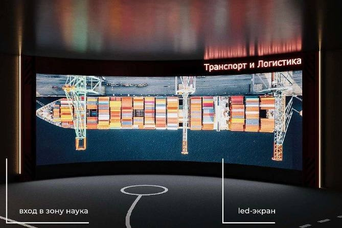 Зона “Транспорт и логистика”. На большом панорамном экране будет вращаться Земля в космосе. Датчики перед экраном распознают человека, и картинка космоса на экране сменится Дальним Востоком. Далее зритель увидит стилизованную логистическую карту Приморского края. На ней будет легкая анимация и объекты, которые можно выбрать, чтобы раскрылась подробная информация — тексты, графика, анимация. Если активности перед экраном не будет, то участник снова переместится в космос. Управление жестами реализуется по технологии Kinect либо при помощи лидаров: можно навести руку на объект и держать некоторое время, чтобы движение распозналось как клик. Среди ключевых активных объектов на карте могут быть: ООО “Морской порт Аврора”, “Новый порт в бухте Суходол”, ООО “Морской Порт “Суходол”, УППК “Север”, ООО “Восточно-Уральский терминал”, ООО “Тихоокеанский балкерный терминал”.