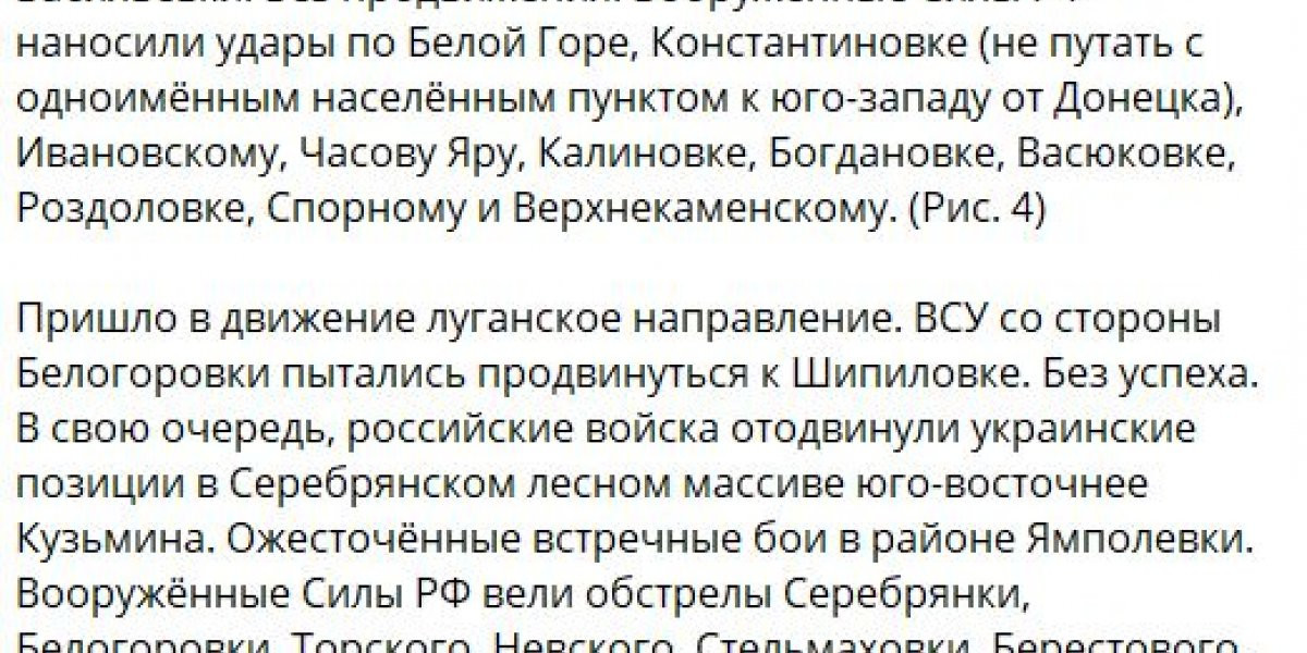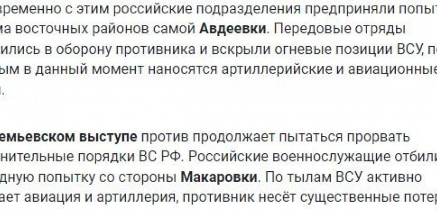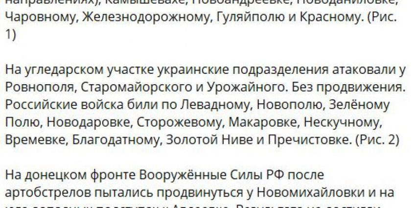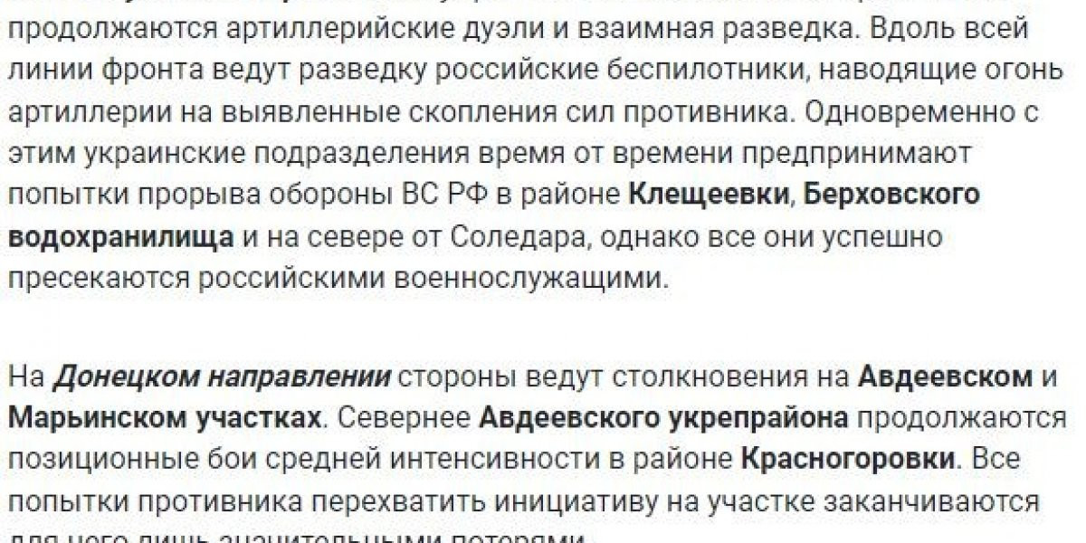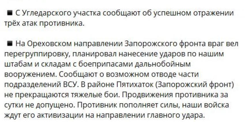 ВСУ на Угледарском участке атаковали в районах Ровнополя, Старомайорского и Урожайного, продвинуться не сумели. На Донецком фронте российские войска вели наступление у Новомихайловки и на юго-западных подступах к Авдеевке. Кроме того, военкор Семен Пегов сообщает о контратаке ВС РФ у Орехово-Василевки на Артемовском направлении.