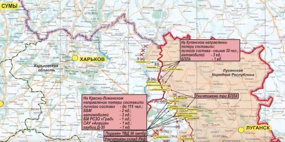 В районе Времевского выступа Россия отразила две атаки украинской стороны силами мотопехотной роты. Две атаки были отражены на Краснолиманском направлении, также пресечена попытка прорыва двух диверсионных группировок.