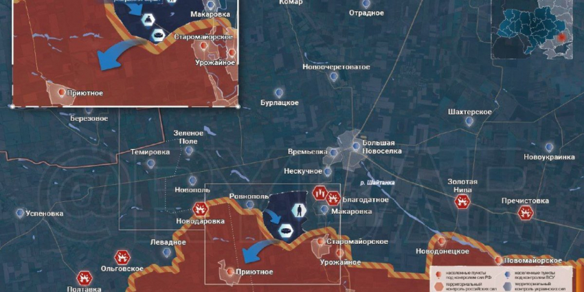 В дополнение к этому было отражено два нападения украинской армии в направлении села Старомайорское. По информации МО РФ, в районе населенного пункта отработала авиация, артиллерия и ТОС группировки войск «Восток».