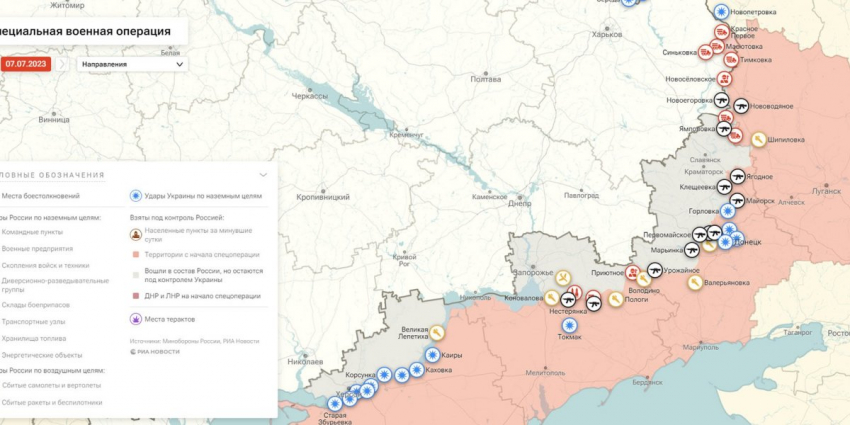 - Карта боевых действий на Украине, к утру 8 июля 2023г., от РИА Новости. Карта специальной военной операции.