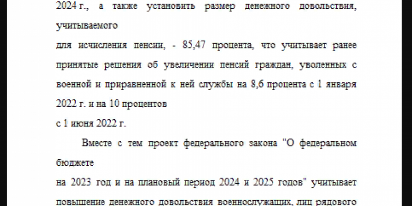 «Кроме того парламентарий обратил внимание на то, что предусмотренное в законопроекте увеличение с 1 октября 2023 года на 10,5 % денежного довольствия военнослужащих, как следствие, повлечет повышение пенсий лицам, проходившим военную и приравненную к ней службу также с 1 октября на 10,5 %.»