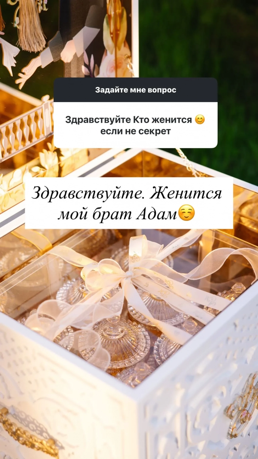 Айшат опубликовала несколько снимков и ответила на вопросы подписчиков. Она рассказала, что свадьба пройдёт в родном селе Кадыровых – Ахмат-Юрте. Также она отметила, что в день свадьбы ей "не до телефона", поэтому она не сможет показать фотографии. Айшат рассказала, что невесту зовут Медни и она из того же села. Она также рассказала, что видео никаких не будет, так как "таково желание родителей", однако свой образ она обещала показать. Больше подробностей Айшат не раскрыла, а только добавила, что её брат счастлив.