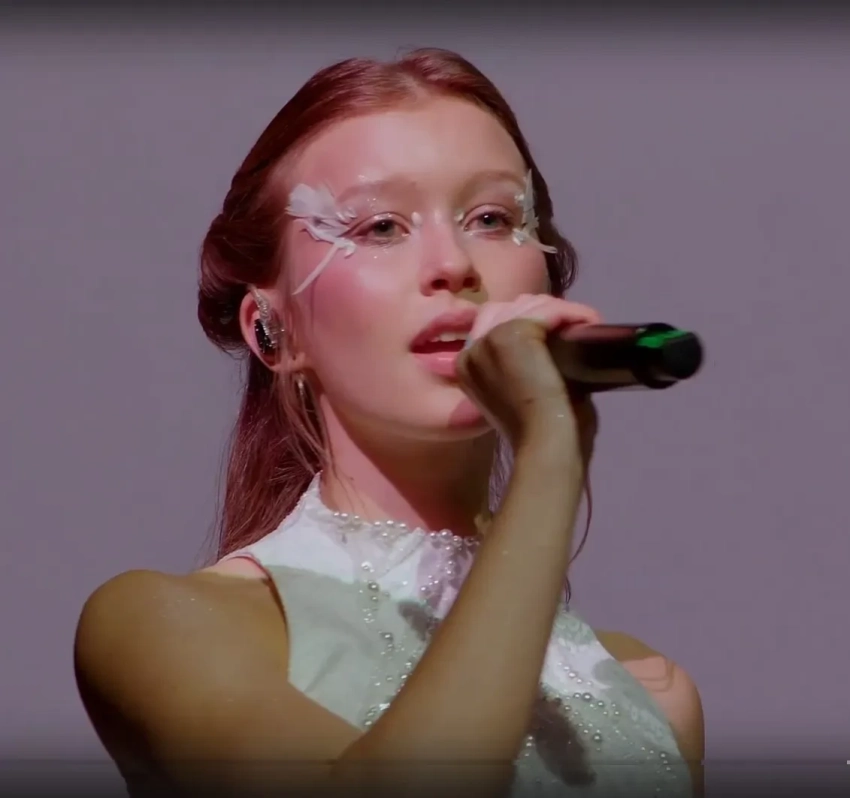 16-летняя актриса вышла под камеры в коротком белом "платье невесты" и с декоративными крылышками за спиной. Её возлюбленный на контрасте был одет в total black. Пара исполнила со сцены свой хит "Силуэт".