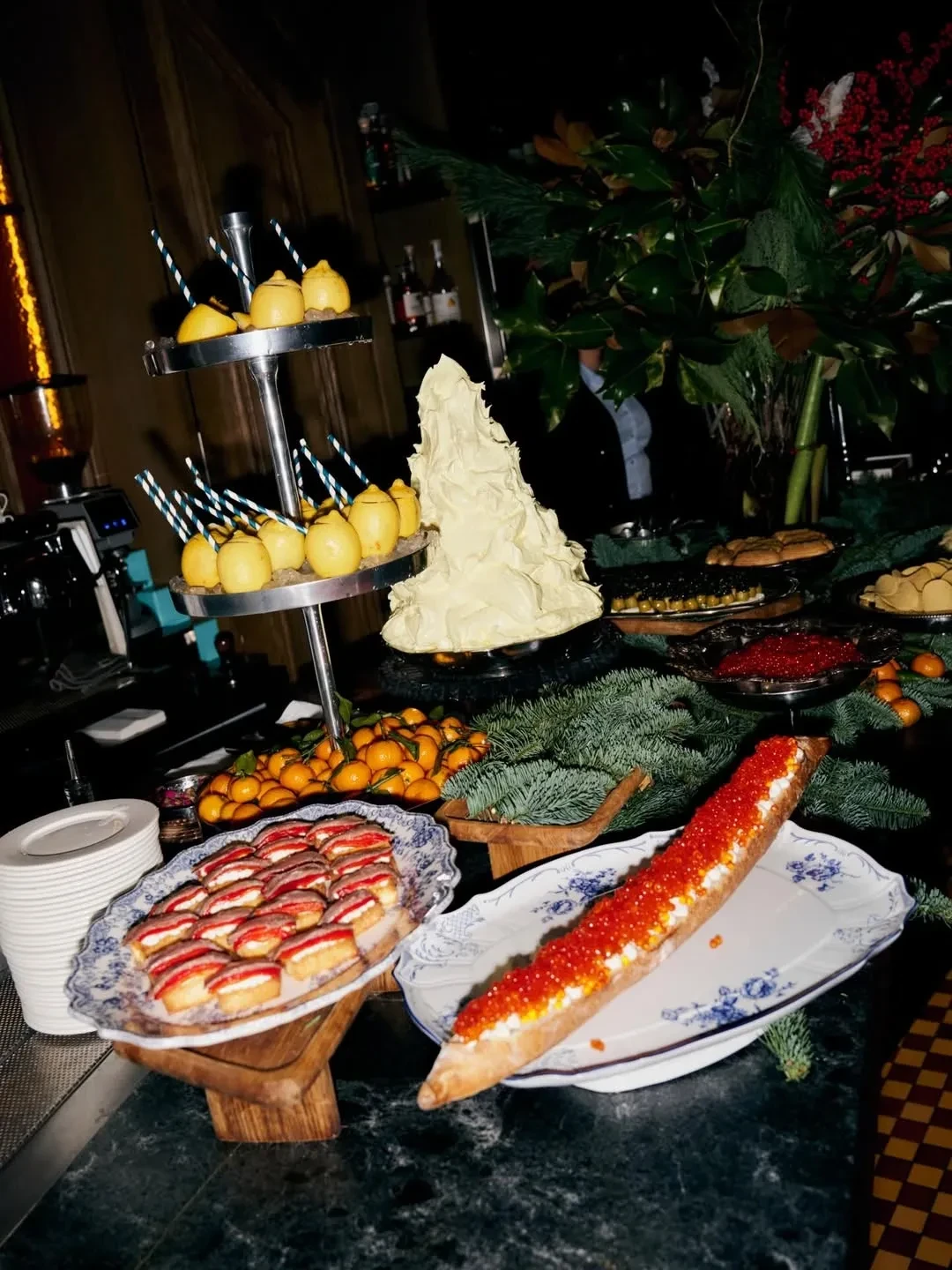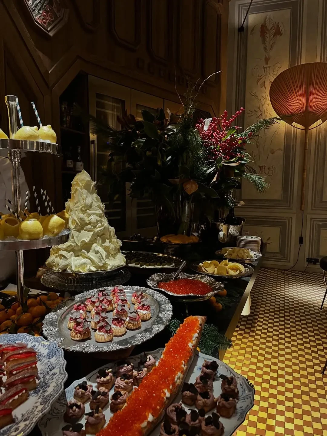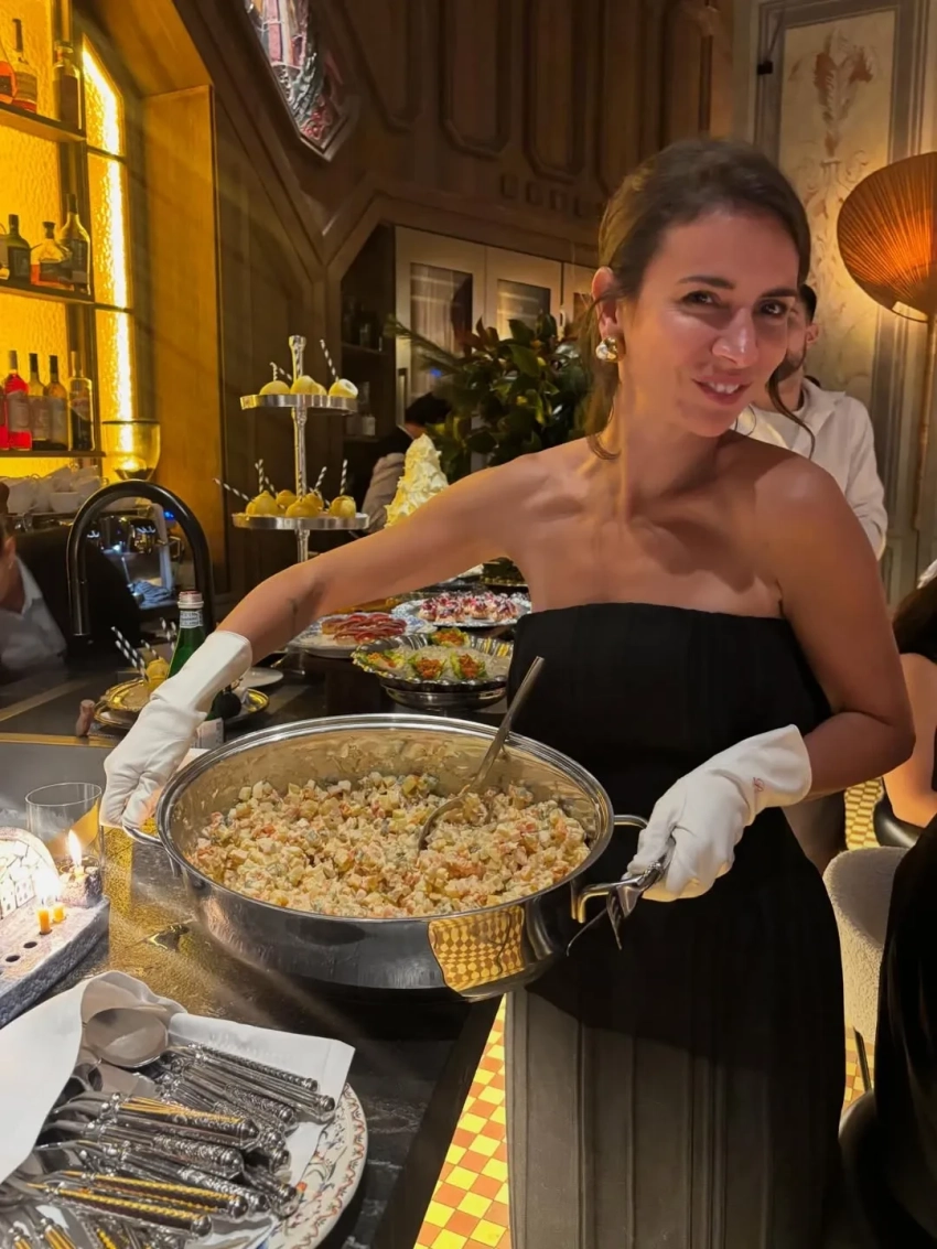 Светские подруги 41-летней Гольденберг, как и она сама, нарядились в вечерние образы, а за ужином их ждали традиционные новогодние угощения: кастрюля салата оливье, бутерброды с икрой, мандарины и игристое вино. Развлекал гостей хор, поющий рождественские колядки.