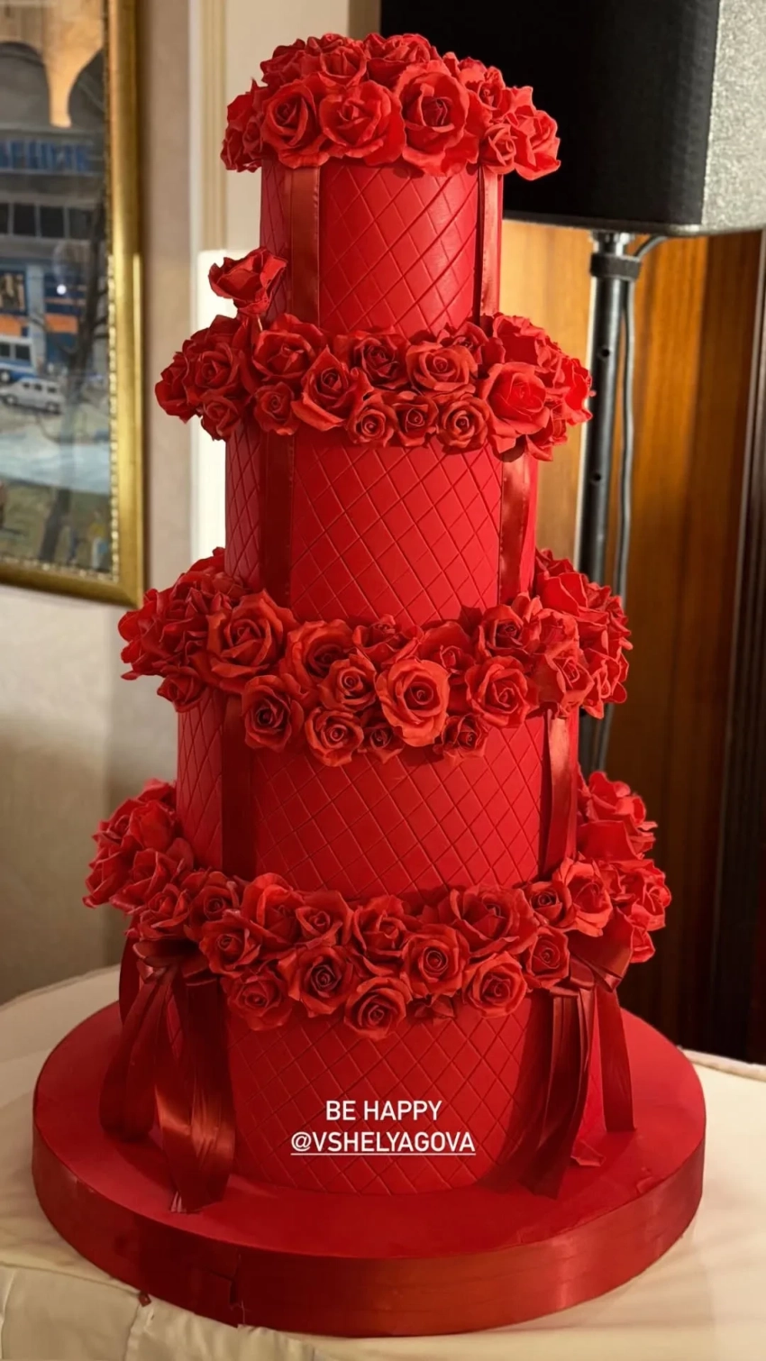 Виктория ШеляговаПосле этого Виктория переоделась в лимонное платье от Versace, и ей вынесли четырёхъярусный торт, украшенный живыми розами. Задув свечи, она пригласила всех спуститься на минус первый этаж в клуб "Амбассадор", где и началось основное веселье: музыка от ведущего и диджея Владимир Абрамкин, а также самих Киркорова, Жасмин и Чеботиной, несколько фотозон и праздничный фуршет.