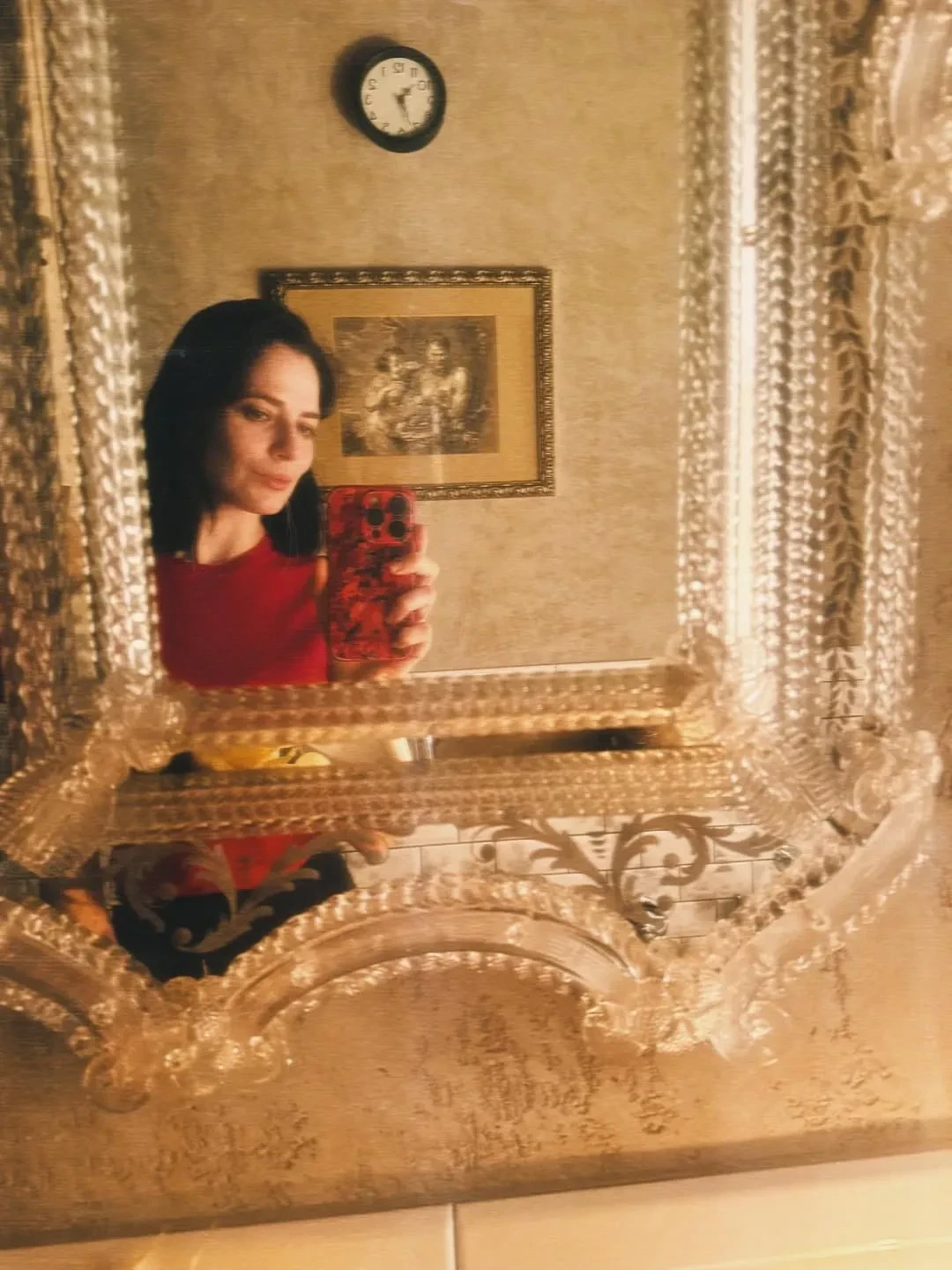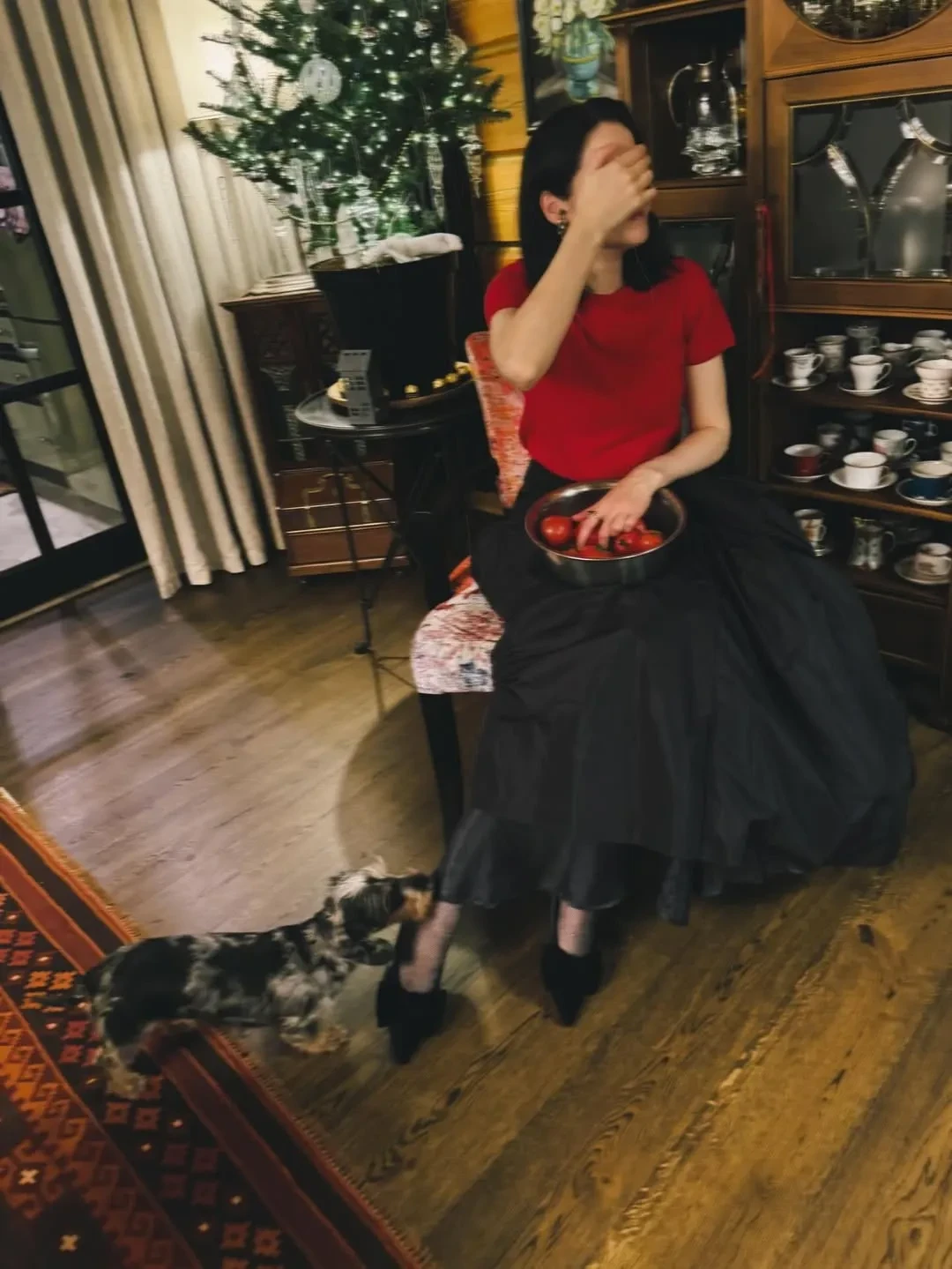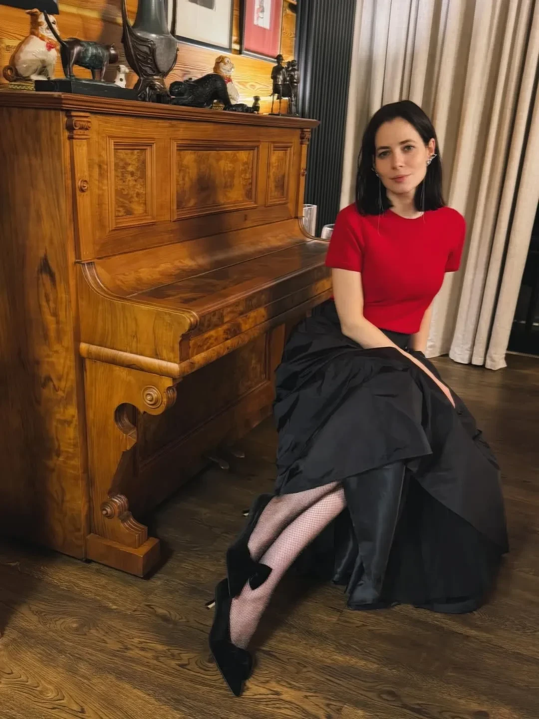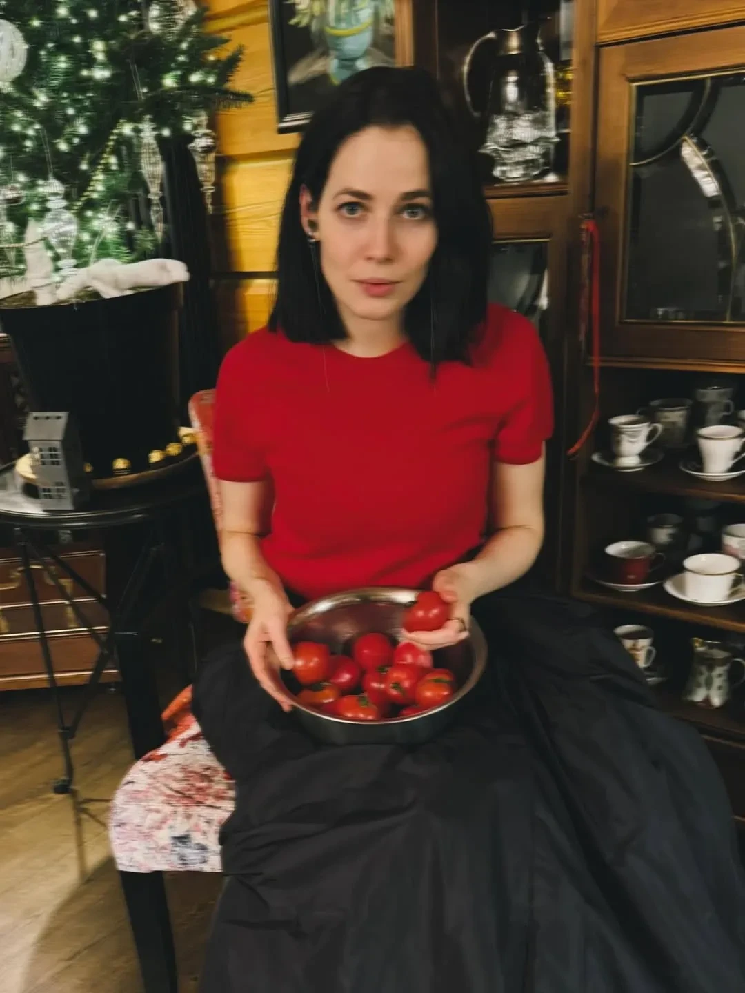 На снимках актриса позирует в красной футболке и чёрной юбке бренда Present & Simple и туфлях Age of Innocence. "Новый год как предчувствие. Вера, надежда и любовь", — подписала фотографии Снигирь.