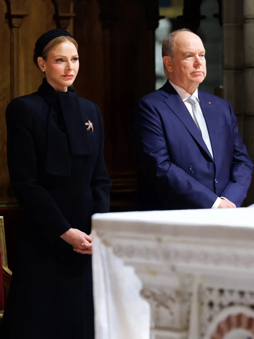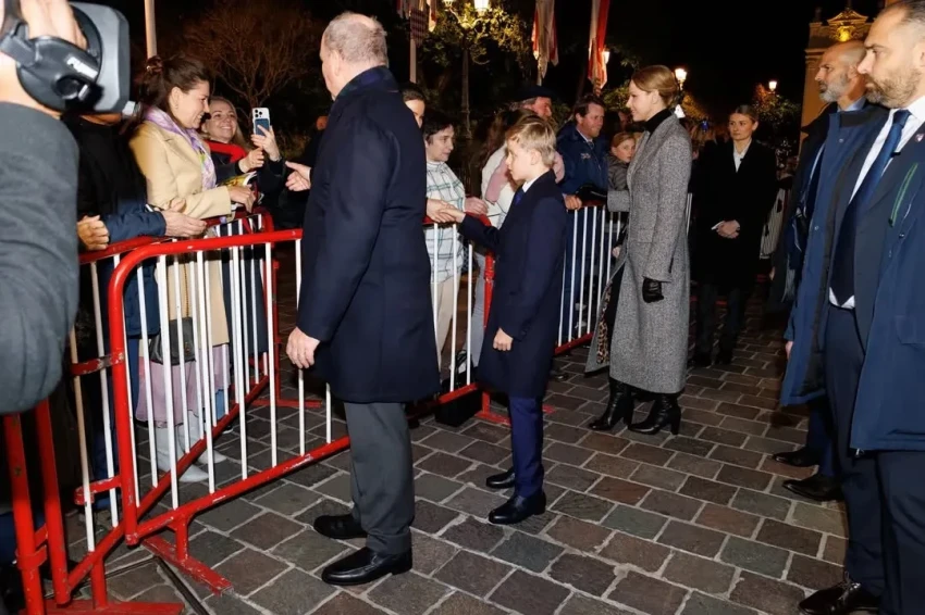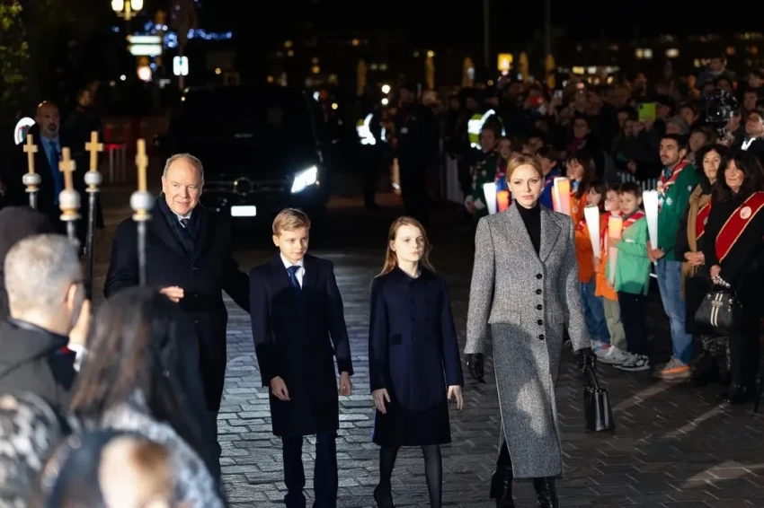 48-летняя княгиня Шарлен для выхода в свет выбрала серое пальто и чёрные кожаные перчатки, дополнив образ сумкой в тон. 11-летние принц Жак и принцесса Габриэлла, а также князь Альбер надели тёмно-синие пальто.