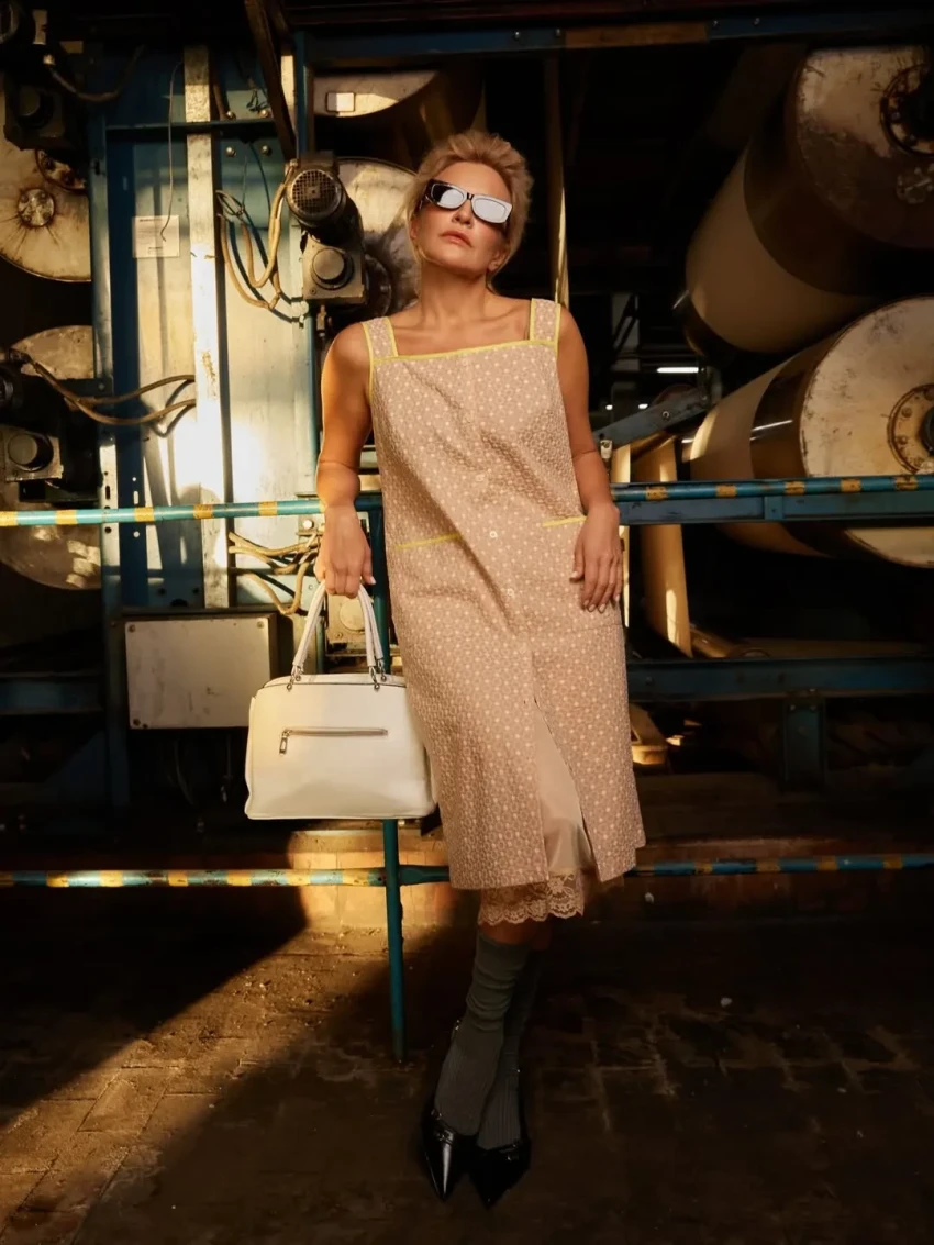 Виктория Шелягова в фартуке и сарафане снялась на швейной фабрике