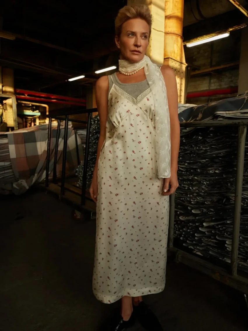 Шелягова примерила фартуки, платья и сарафаны с уникальными принтами, которые были специально отобраны и воссозданы художниками Шуйской фабрики по архивным образцам XVIII—XIX веков и перенесены на современный ситец.
