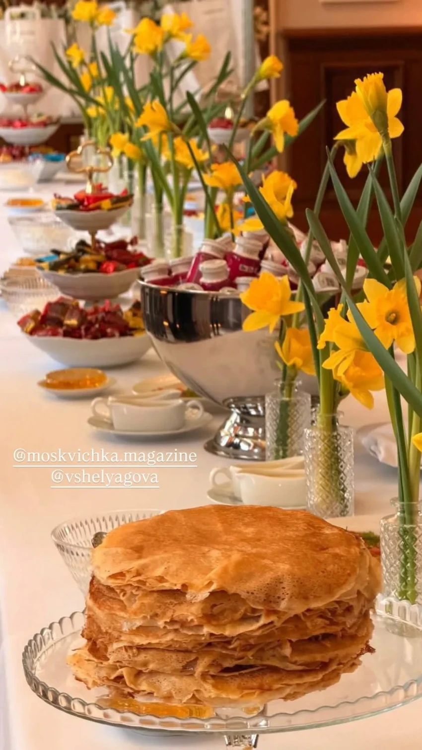 Хозяйка праздника, которая лишь недавно сделала пластическую операцию, появилась перед гостями с внучкой. Присутствующих, для которых был объявлен "жёлто-белый" дресс-код, угощали блинами, их развлекал казачий хор. Пространство было украшено живыми нарциссами.