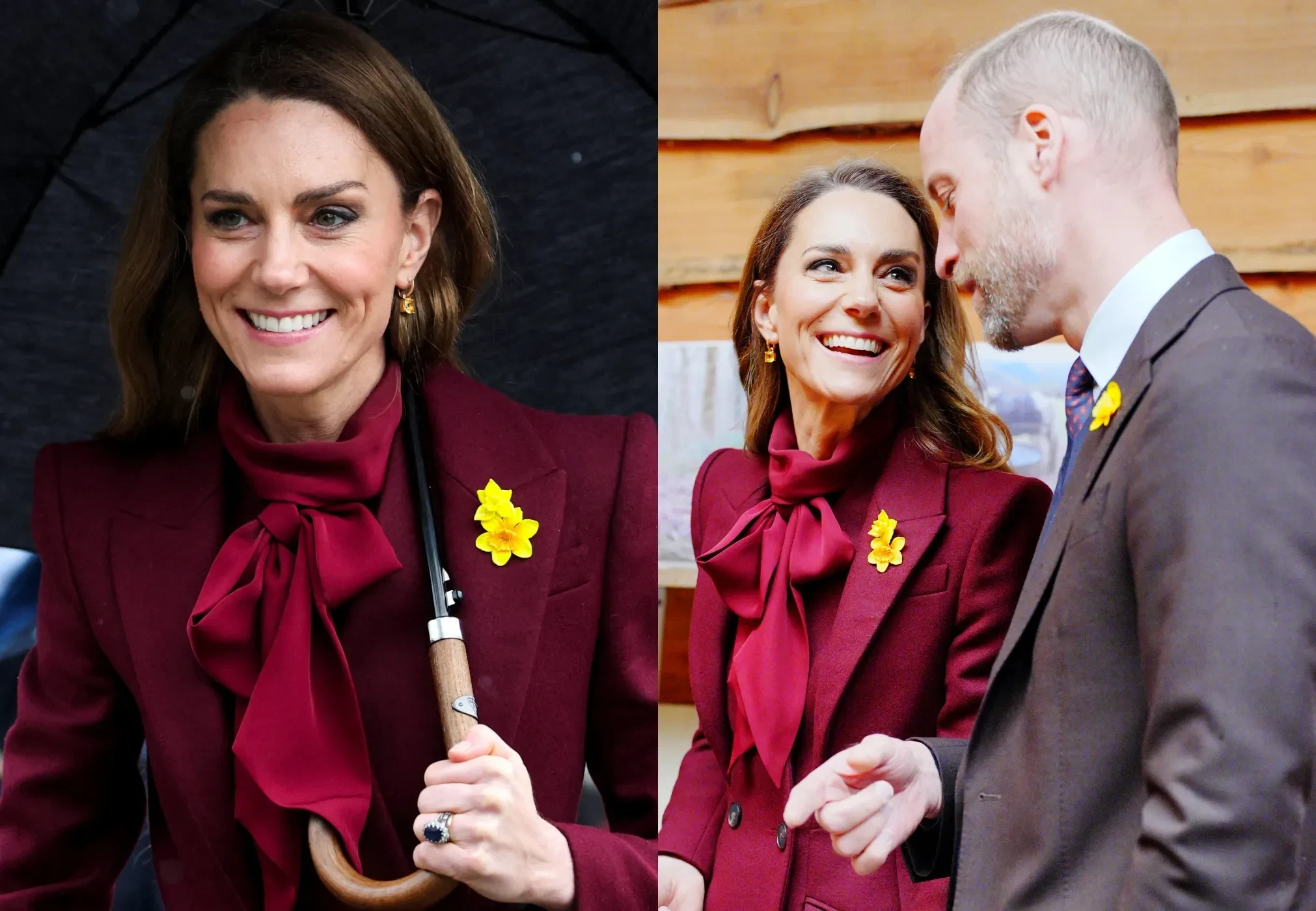 Для визита 44-летняя Кейт выбрала образ в бордовых оттенках: она была в любимом красном пальто от Alexander McQueen, которое уже не раз носила на публике, блузе с бантом, макси-юбке и высоких лакированных сапогах. 43-летний Уильям предпочёл коричневый пиджак, синий джемпер и брюки прямого кроя. На груди у пары красовались одинаковые броши в виде нарциссов — символа святого Давида, который традиционно носят в день праздника как знак уважения к валлийскому наследию.