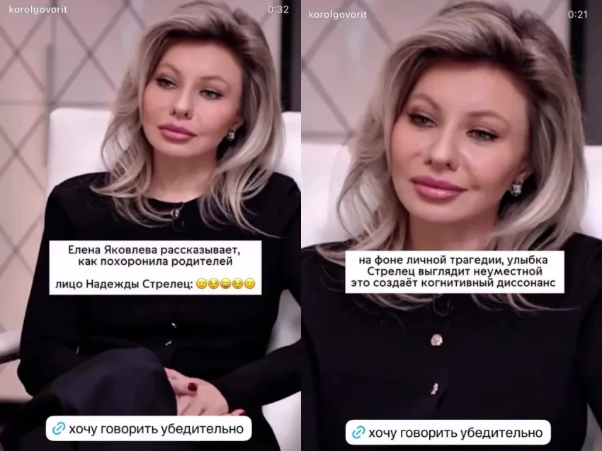 Фото Надежды СтрелецВ дополнение к своим словам Надежда приложила видео своей реакции на слова Елены Яковлевой о смерти родителей, где видно, что она в тот момент не улыбалась.