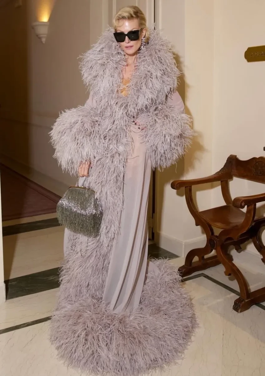 Литвинова отправилась на шоу в длинном платье Gucci с перьями. Образ дополнили серебристая сумка с бахромой, массивные серьги с бриллиантами и солнцезащитные очки.