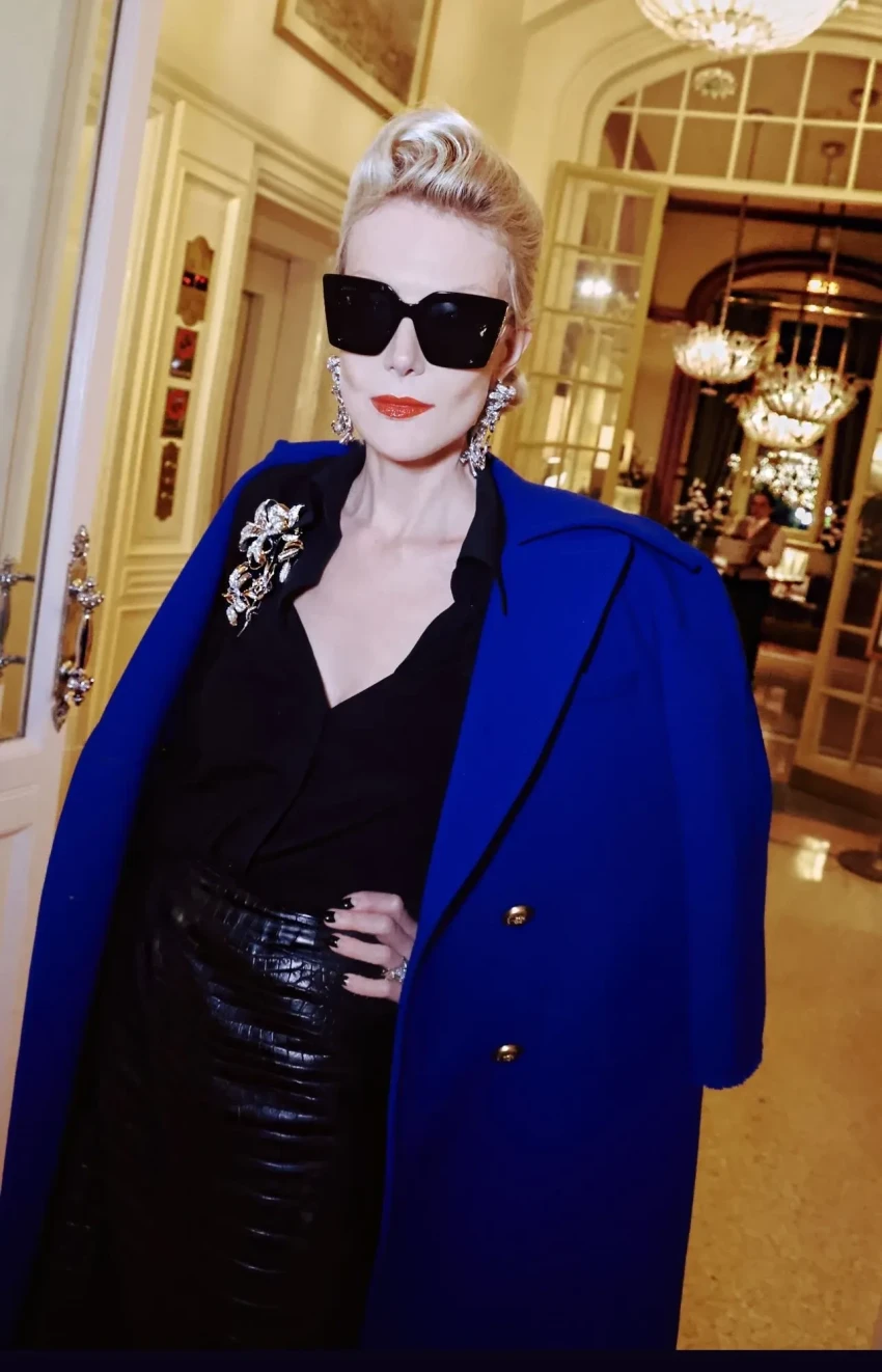 Фото Ренаты ЛитвиновойТакже Рената Литвинова показала второй образ Gucci, который она примеряла незадолго до показа. Актриса позировала в синем пальто, кожаной юбке и блузе с декольте, которую украшает брошь в тон серьгам.