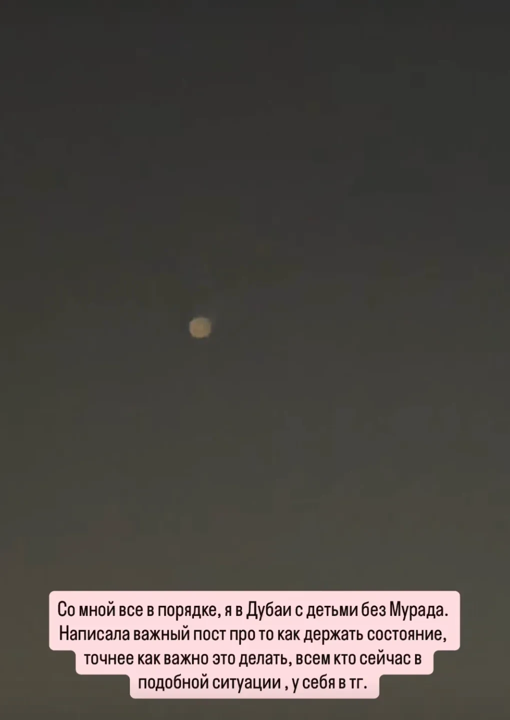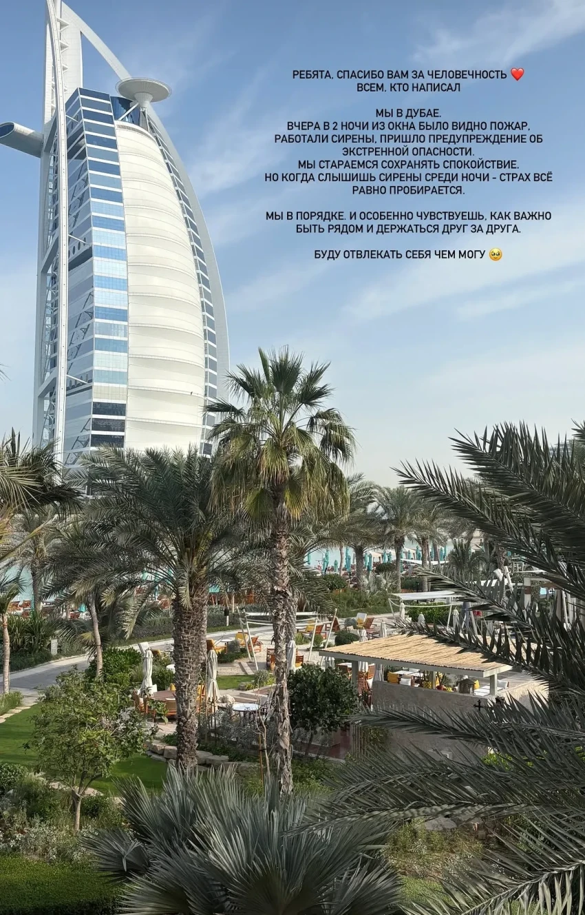 ПашуПлемянница миллиардера Араза Агаларова и двоюродная сестра певца Эмина Сабина Агаларова рассказала, что один из взрывов был рядом с её домом. Блогер Наталья Османн тоже находится в Дубае — с детьми и без супруга Мурада. Она назвала прошедшую ночь "сложной" и слышала "много взрывов".