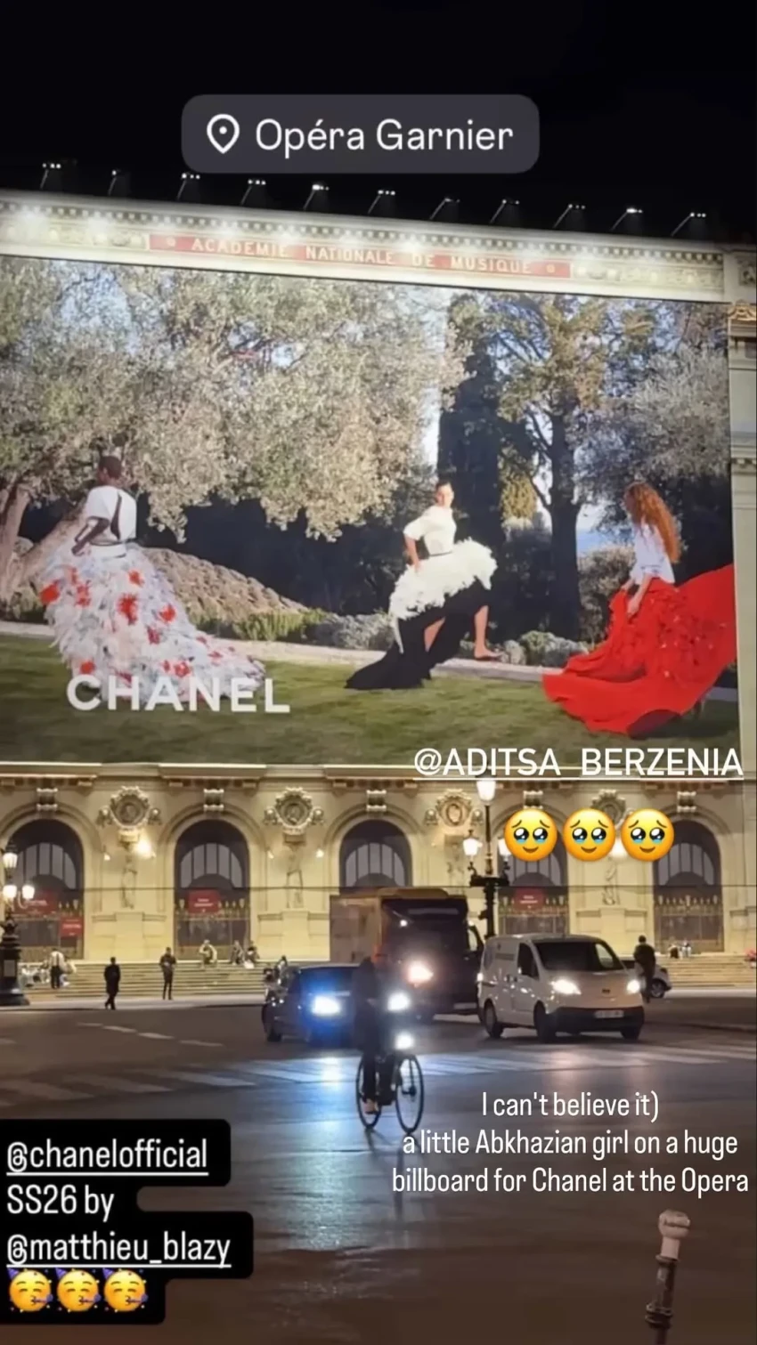 Сторис* Адицы БерзенииБерзения официально стала лицом Chanel в начале 2026 года. Она была выбрана новым креативным директором дома Матье Блази в качестве своей музы и приняла участие в кутюрном показе бренда в Гран-Пале. До этого она открывала дебютное шоу Блази для Chanel.