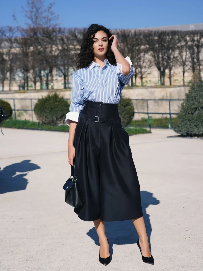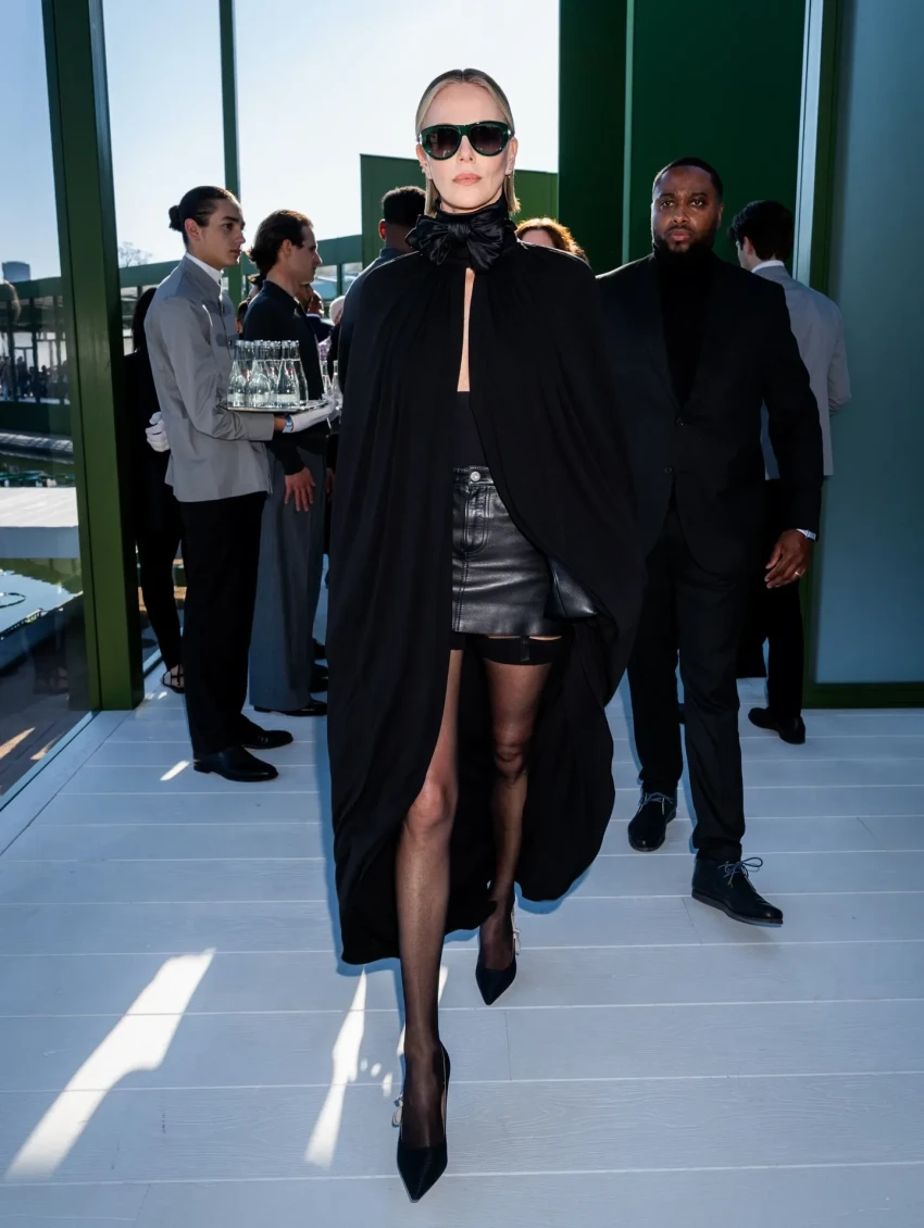21-летняя Дева Кассель появилась в саду Тюильри, который выступил площадкой для показа, в синей рубашке в полоску и чёрной юбке-миди, дополнив наряд сумочкой и лодочками на невысокой шпильке. 50-летняя Шарлиз Терон выбрала total black образ: на ней была кожаная мини-юбка, топ и накидка с бантом на шее. 18-летняя Эвер Андерсон, ставшая недавно лицом Dior, блистала в приталенном платье-пальто в коричневую клетку.