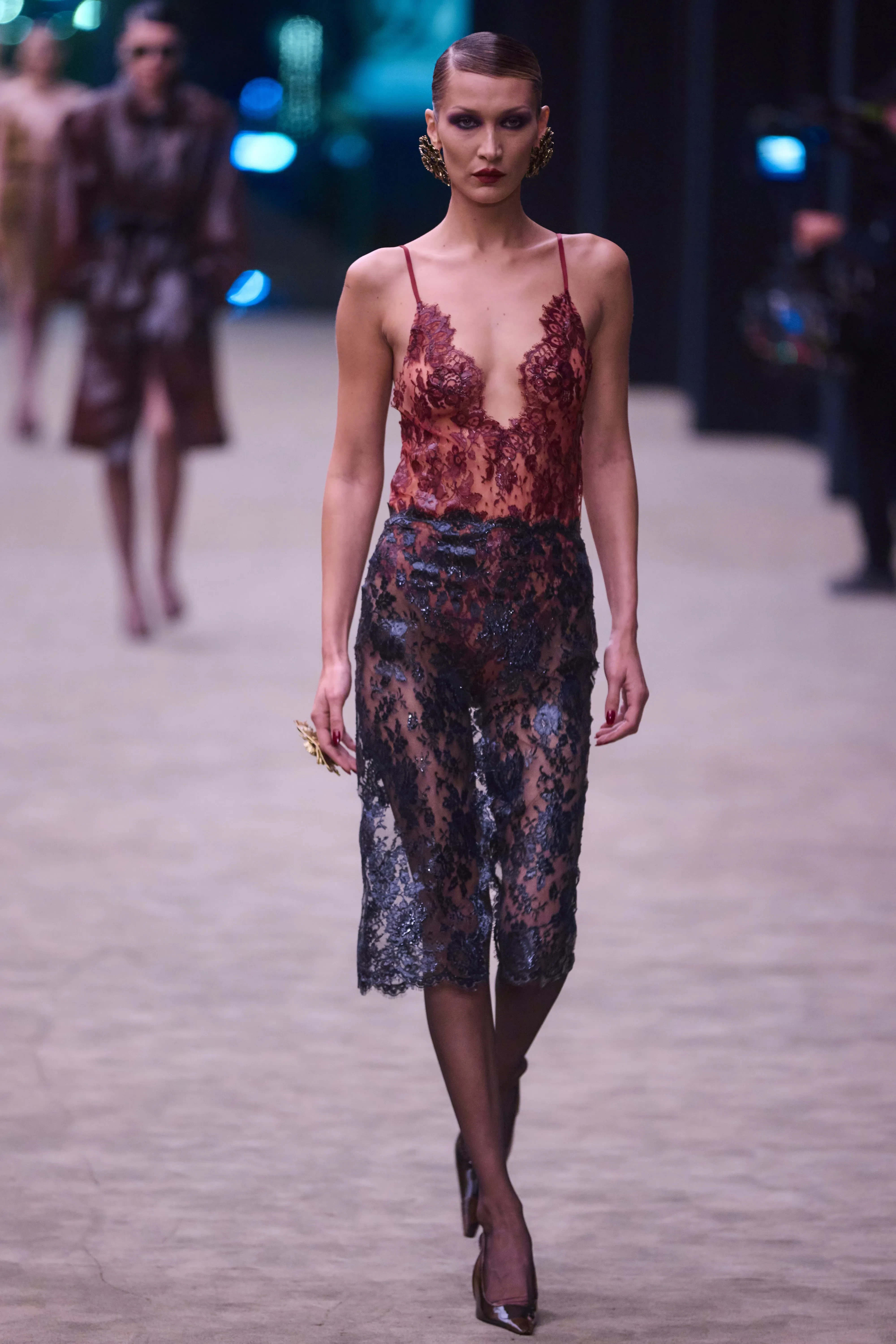 РозэНа подиум на показе осенней коллекции Saint Laurent вышла Белла Хадид в наряде с декольте. В шоу также приняли участие российские модели Алина Миллер и Таня Чурбанова.
