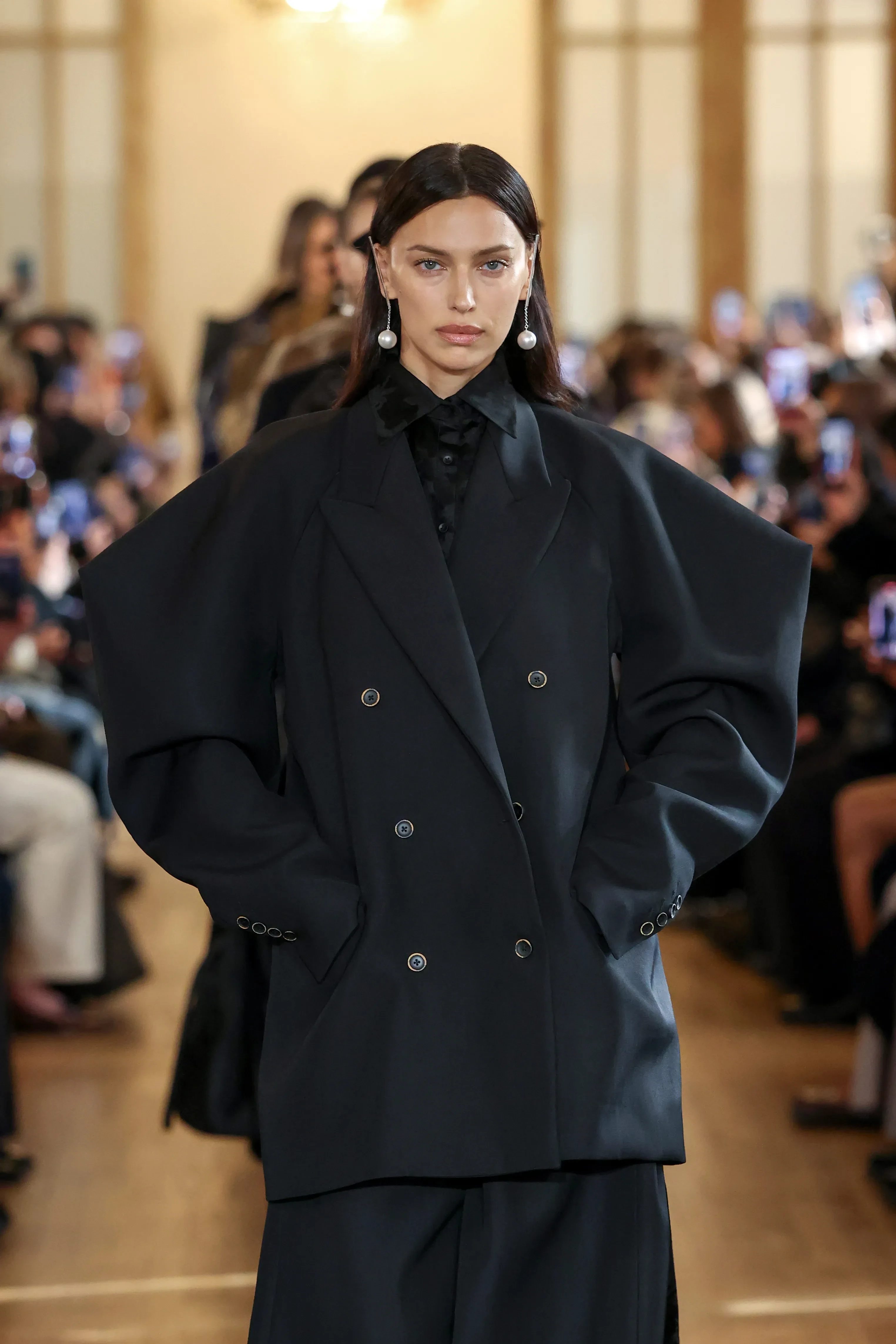 Ирина Шейк вышла на подиум на показе Uma Wang, который состоялся в рамках Недели моды в Париже. 40-летняя модель дефилировала в total black образе: на ней был жакет с объёмными рукавами, чёрная рубашка и макси-юбка. Завершали наряд балетки с бантами и фактурные серьги с белыми бусинами.