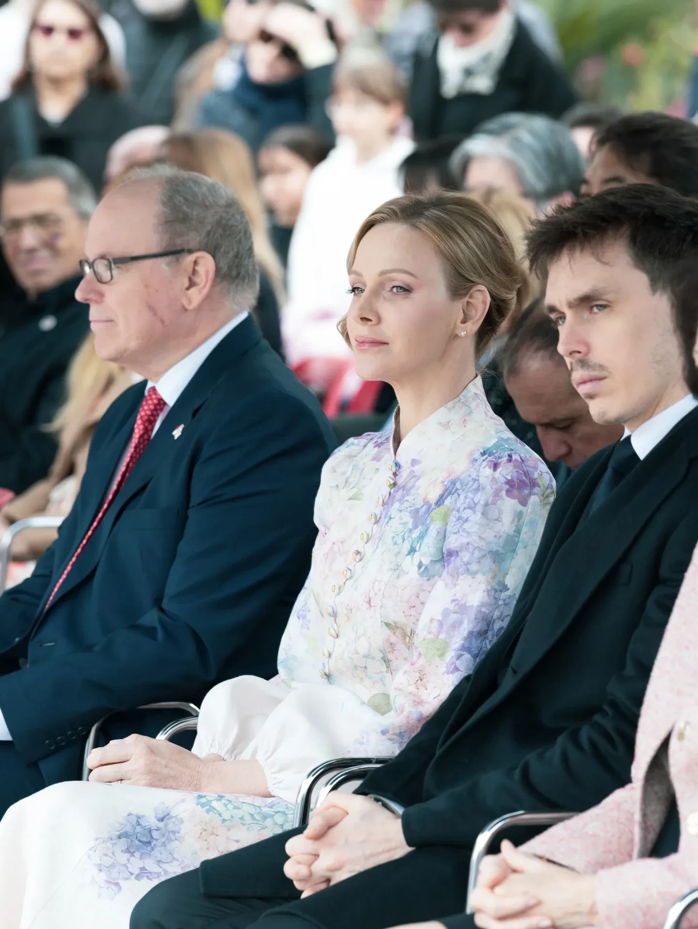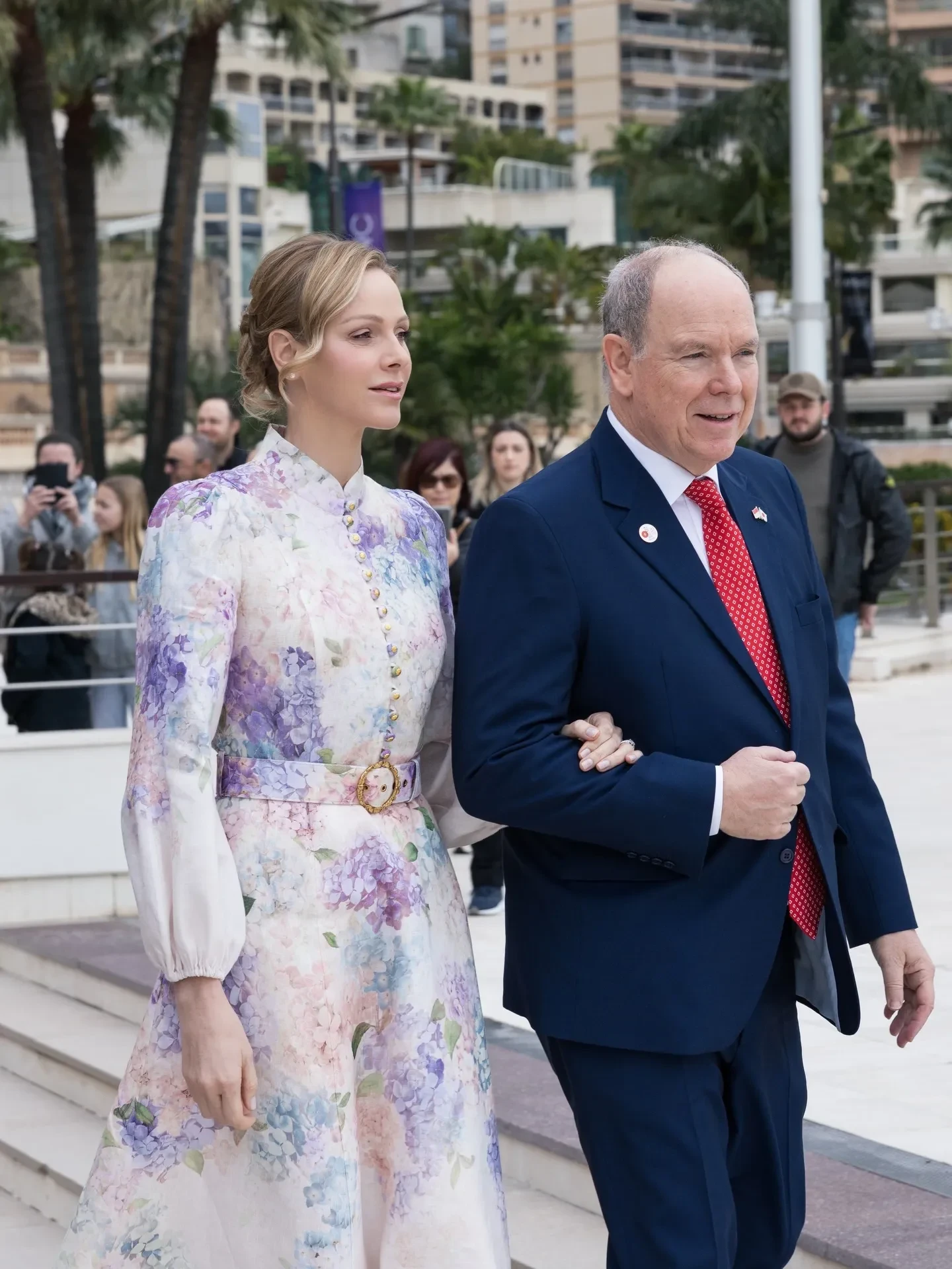 Сначала пара отправилась на площадку рядом с Форумом Гримальди, где в сопровождении японской принцессы Акико Микасы дала старт "Японии в Монако" — мероприятию, посвящённому 20-летию дипломатических отношений между княжеством и Японией. 48-летняя Шарлен появилась на публике в светлом платье Zimmermann с цветочным принтом и воротником-стойкой, а 68-летний Альбер был в классическом синем костюме.