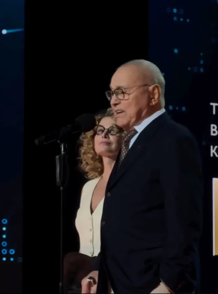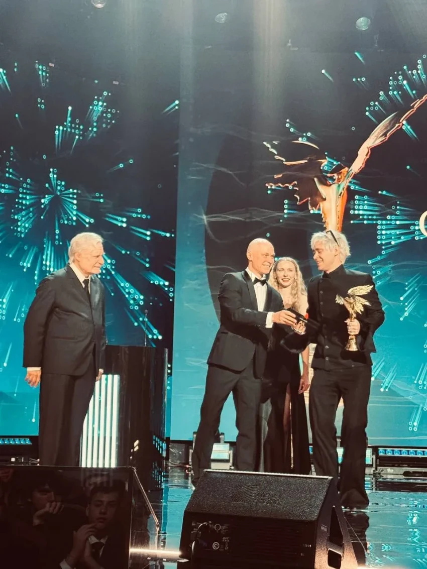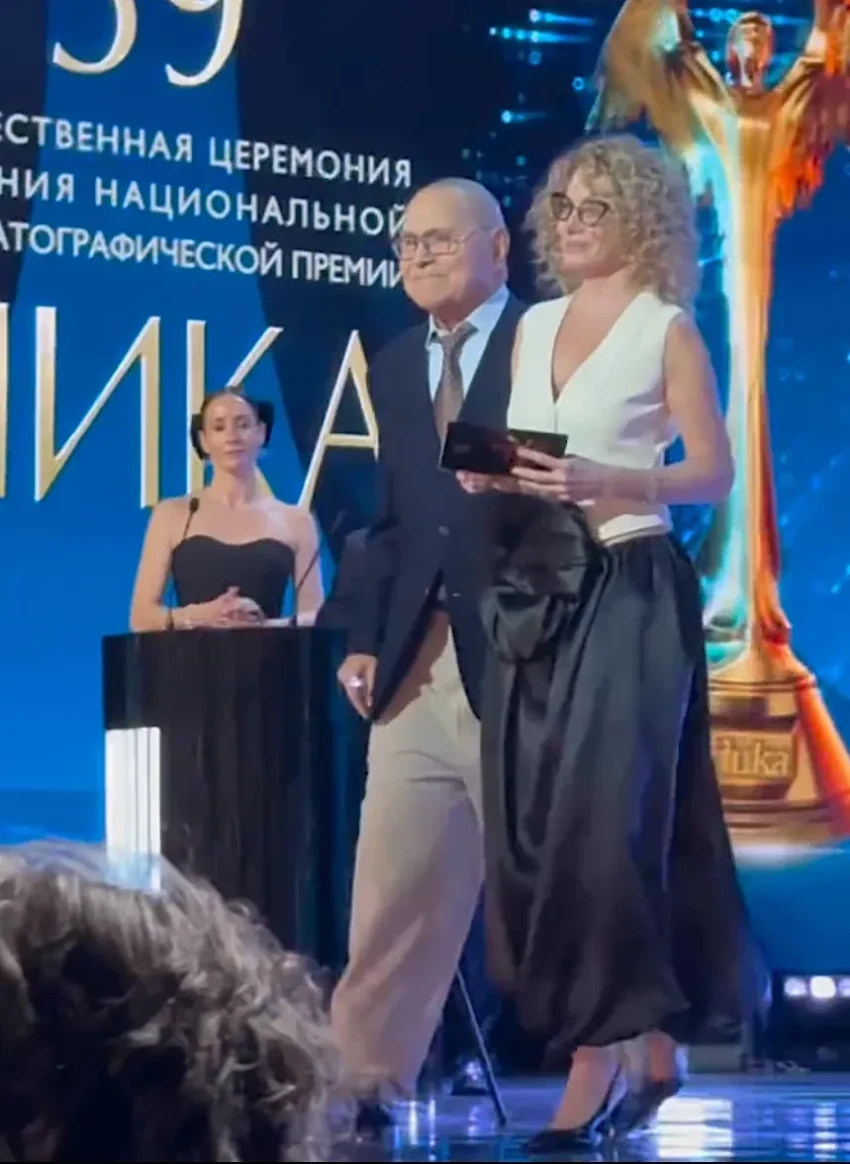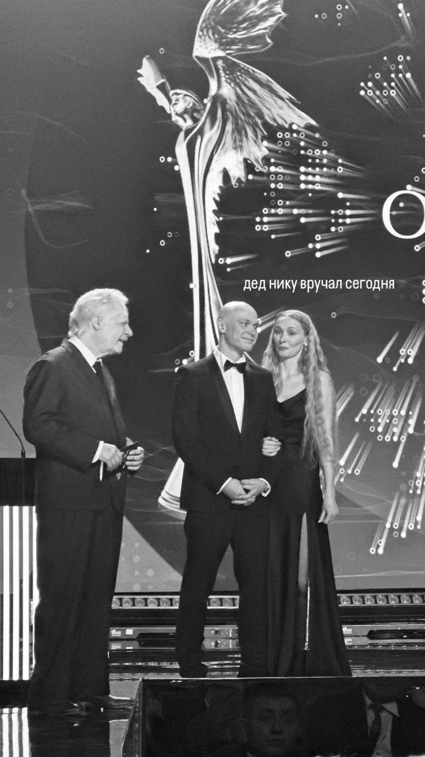 Юлия Снигирь и Евгений ЦыгановЕвгений Цыганов после красной дорожки перевоплотился в своего персонажа из фильма "Батя 2. Дед" и вместе с 33-летним Юрой Борисовым и 35-летней Анной Шевчук вручил премию режиссёру Феликсу Уварову.