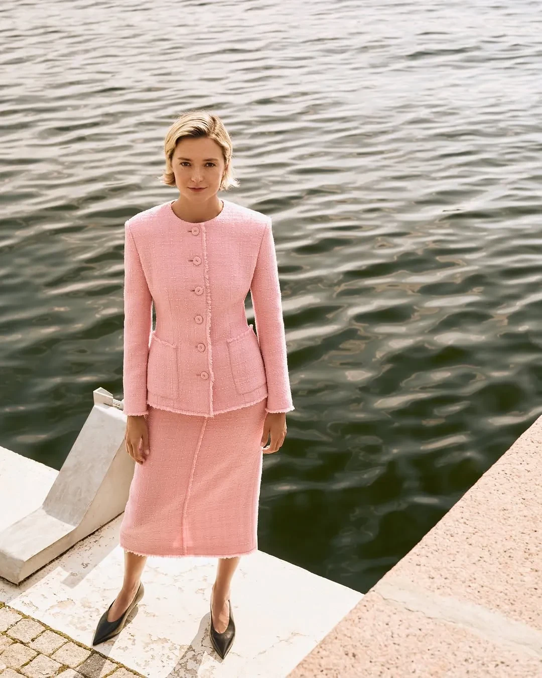 39-летняя Надежда Михалкова снялась в рекламной кампании российского модного бренда Ushatava. На фото актриса и дочь режиссёра Никиты Михалкова позирует в сером жакете с чёрной сумкой и солнцезащитными очками.
