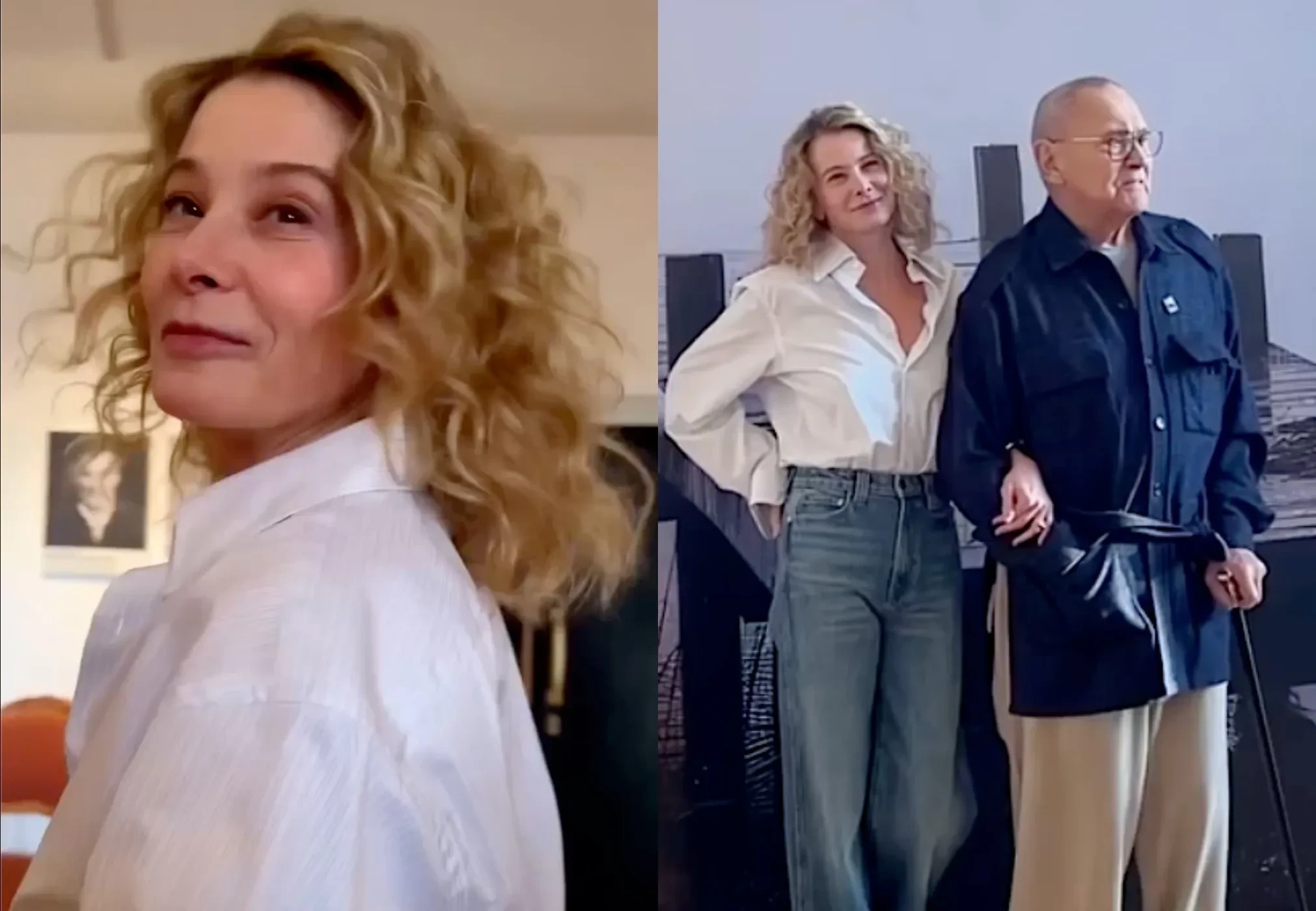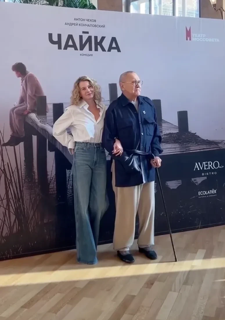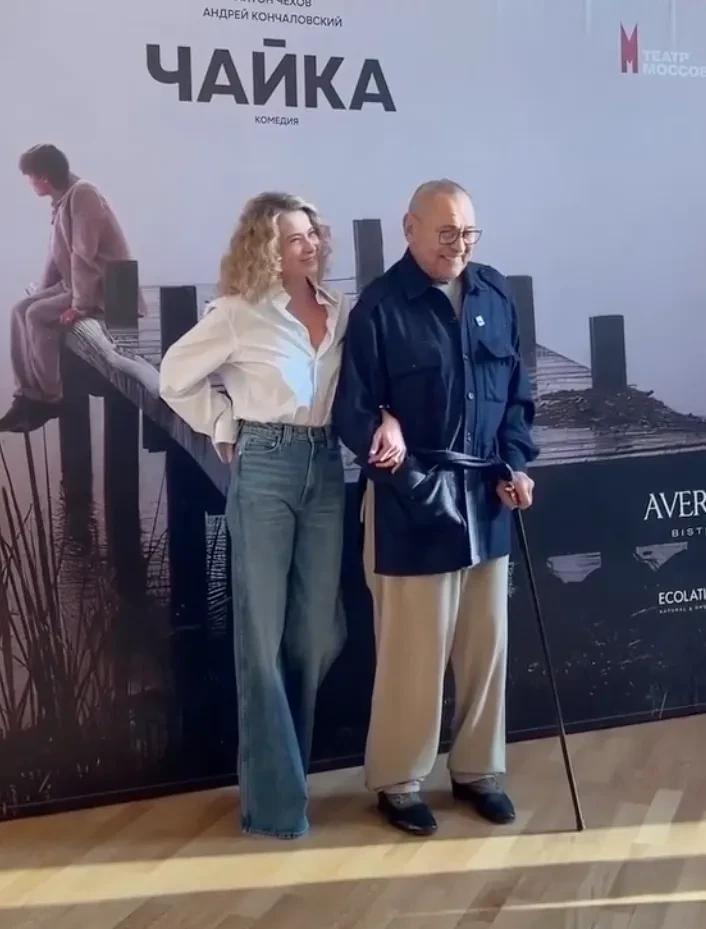 52-летняя Юлия Высоцкая вместе с мужем Андреем Кончаловским, которые недавно посетили кинопремию "Ника", вышли в свет в Москве. Актриса и 88-летний режиссёр появились перед прессой между показами спектаклей в Театре Моссовета. Высоцкая в белой рубашке и синих джинсах позировала рядом с супругом, который был одет в синюю рубашку.