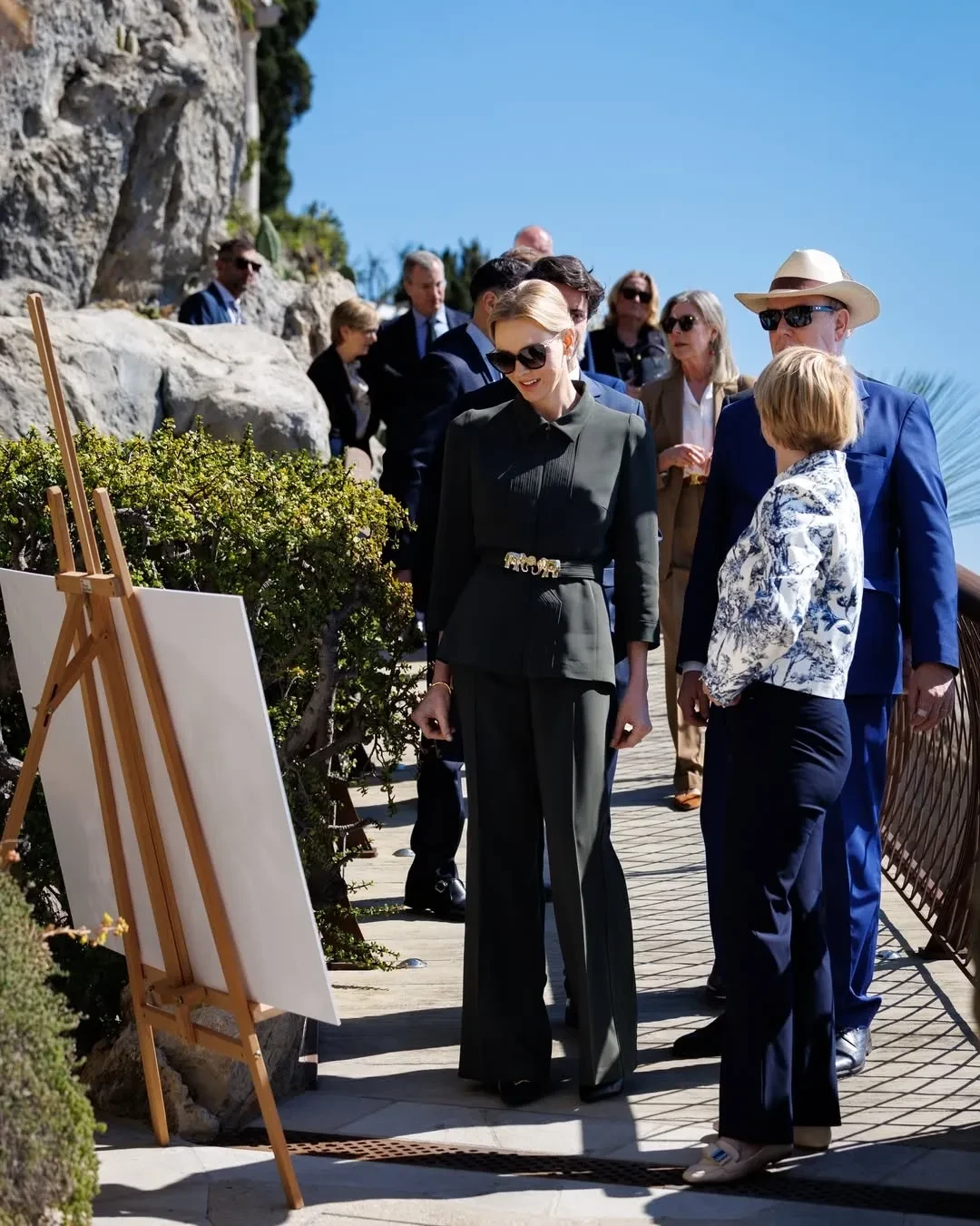 48-летняя княгиня Шарлен появилась на публике в тёмно-зелёном брючном костюме Elie Saab и туфлях на каблуках. Образ дополнили солнцезащитные очки и золотые серьги. 68-летний князь Альбер II был одет в синий костюм с галстуком, солнцезащитные очки и шляпу.
